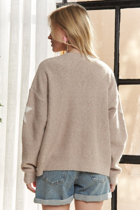 Star Shape Long Sleeves Sweater Cardigan - Taupe/Ivory