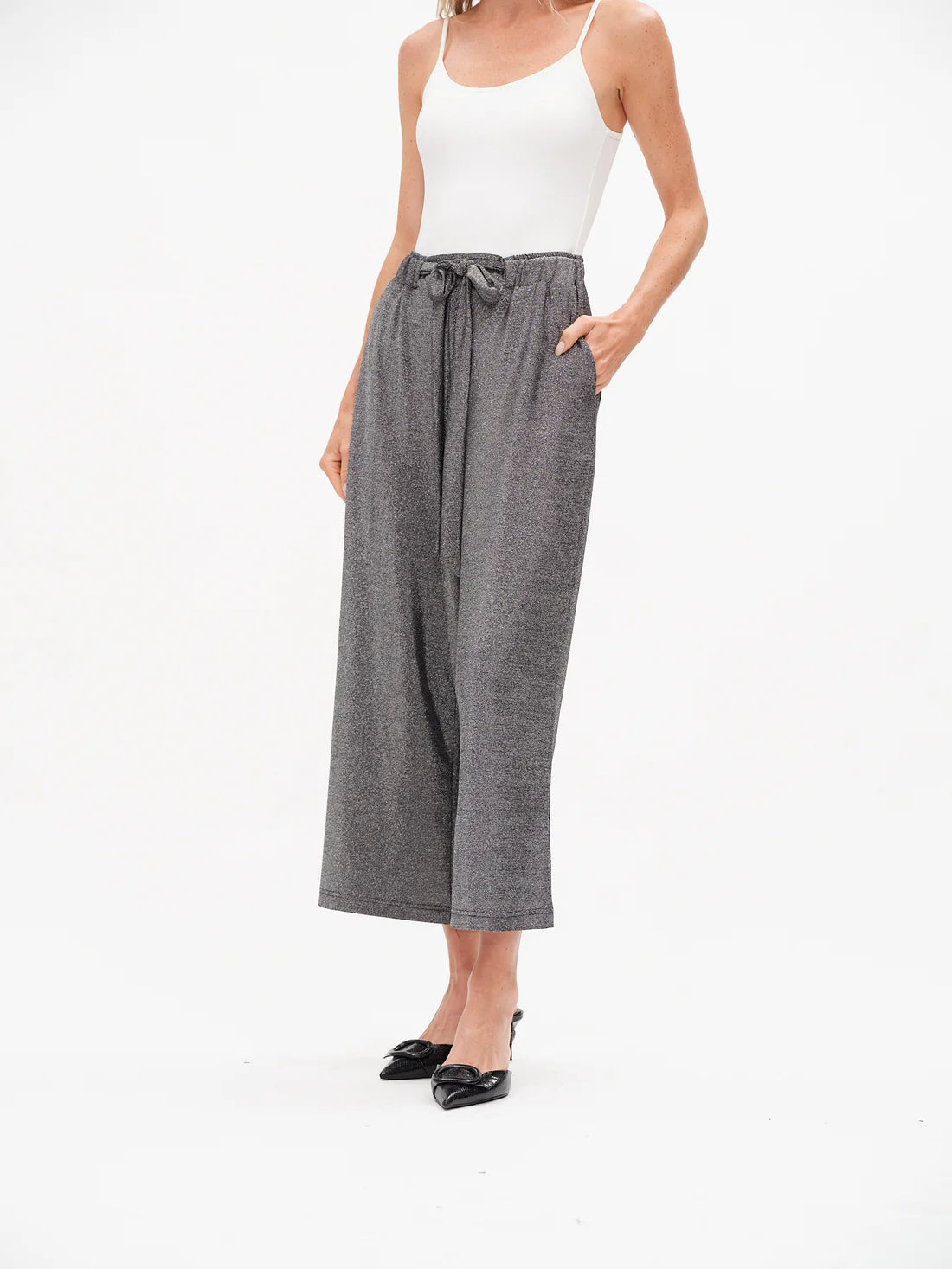 Experience effortless style with the Anywhere Pant, crafted from lightweight, flowy lurex fabric that offers a subtle shimmer in silver and black. These cropped pants feature a comfortable drawstring waist for a customizable fit, perfect for all-day wear. Their breathable, soft texture makes them ideal for any occasion, blending comfort with a chic, modern edge. Elevate your wardrobe with pants designed to move with you, wherever life takes you.