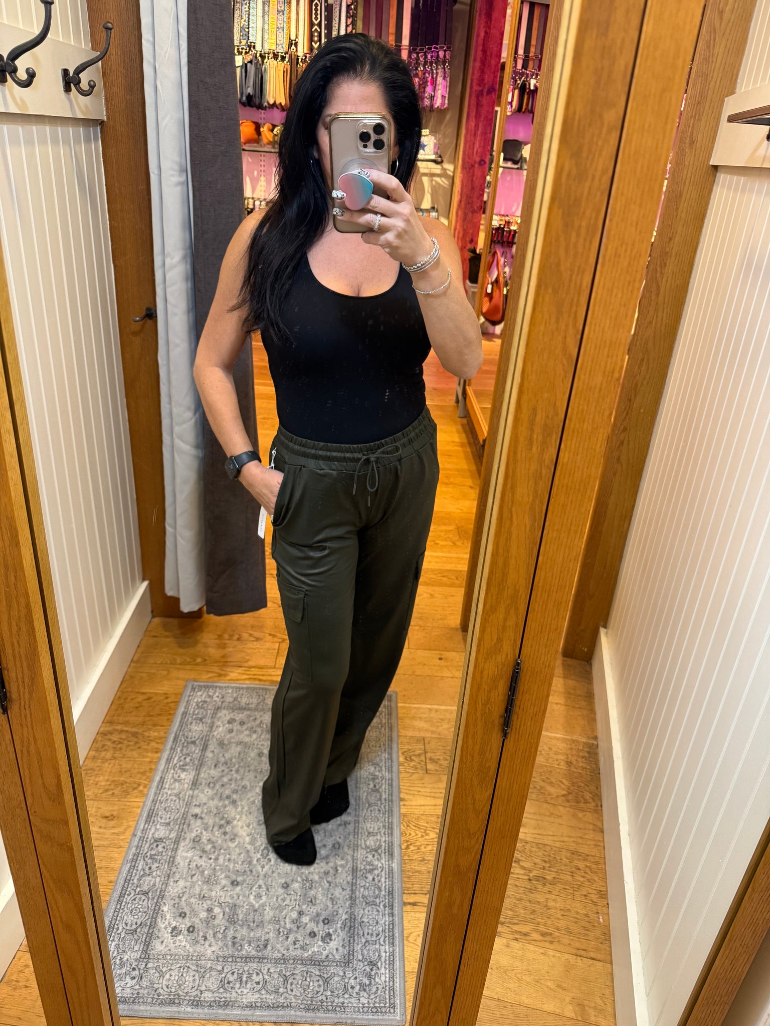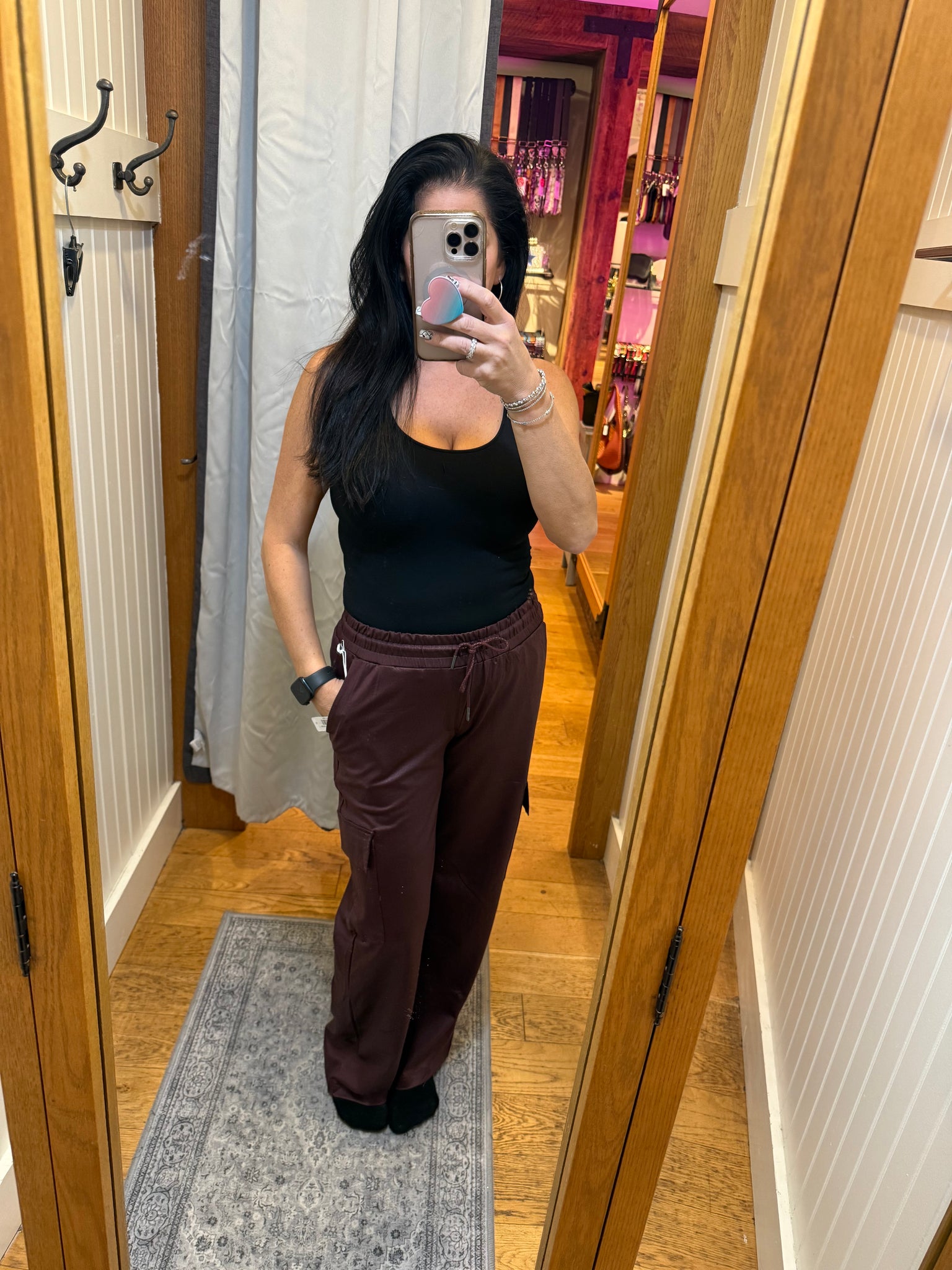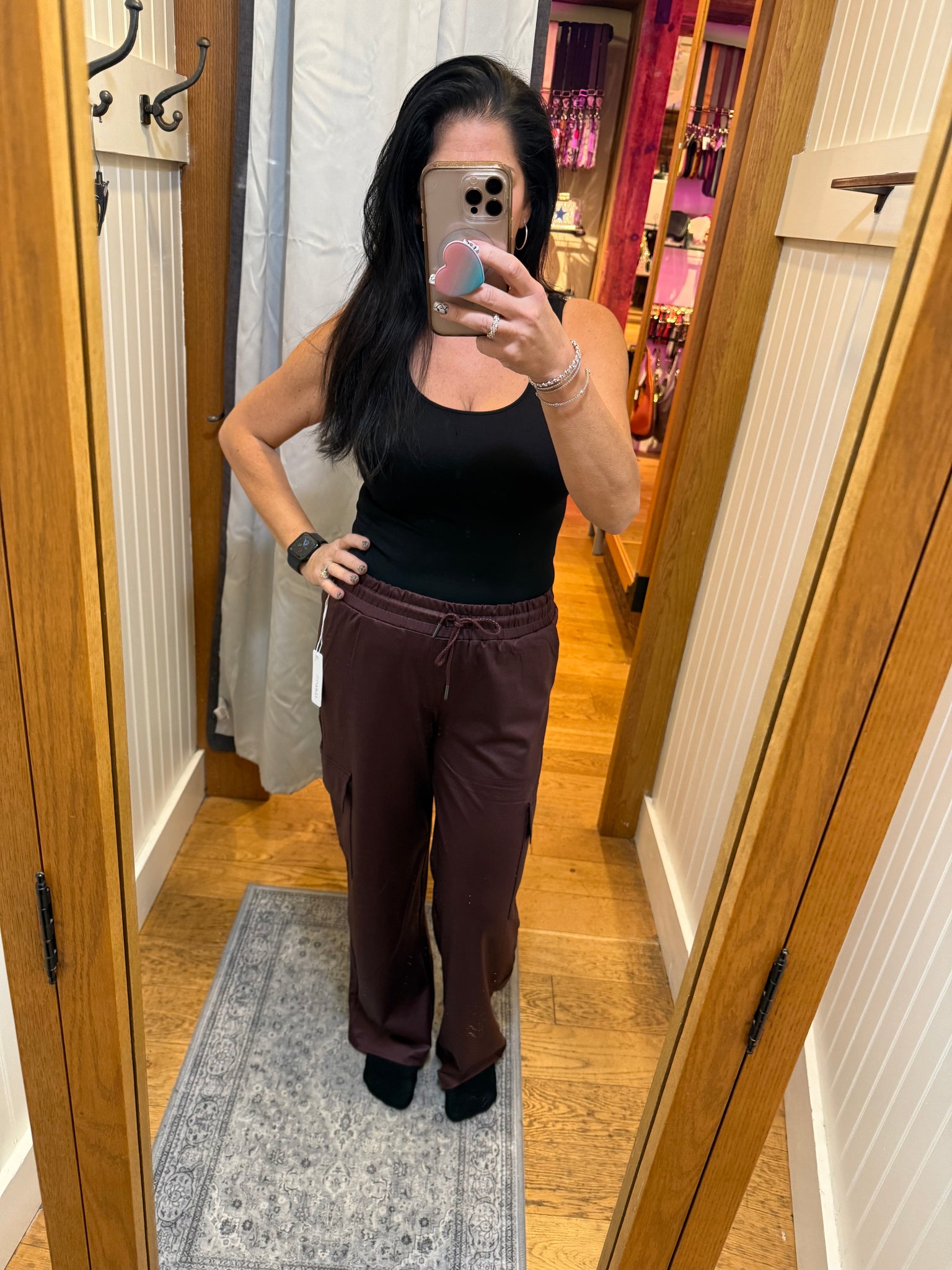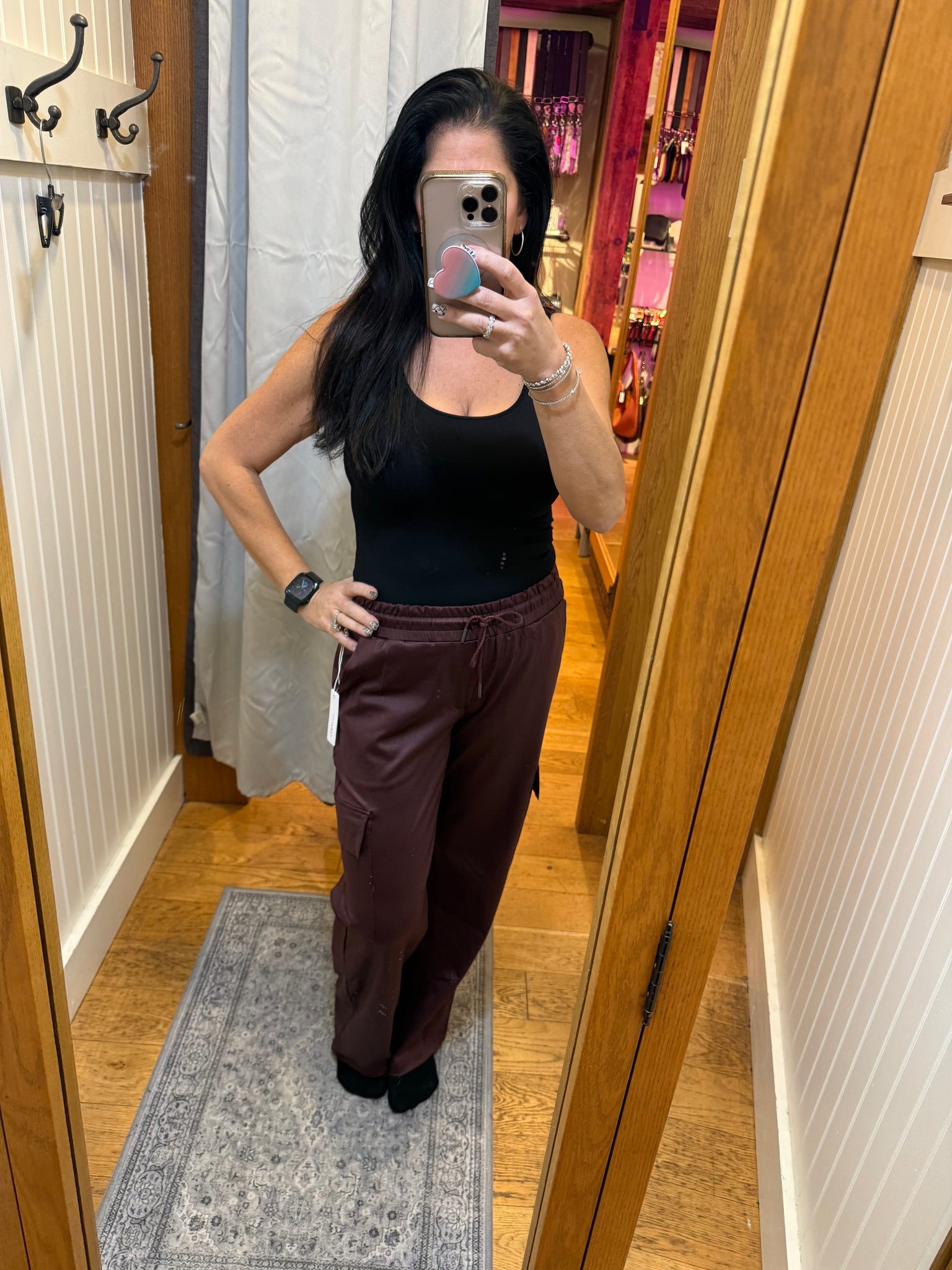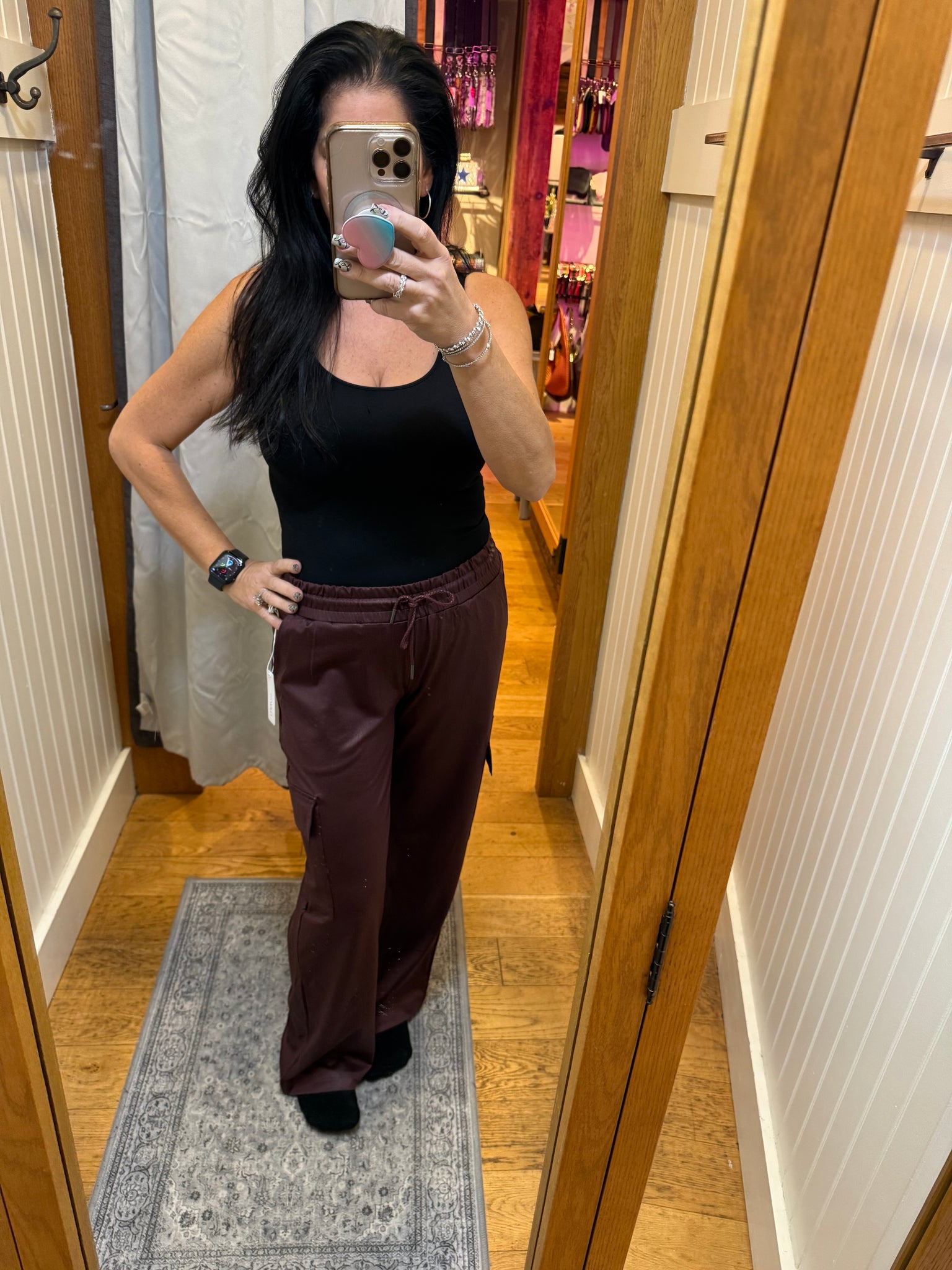 Runs true to size I am wearing size medium. I like a little extra room in the waist in a pant with an elastic waist