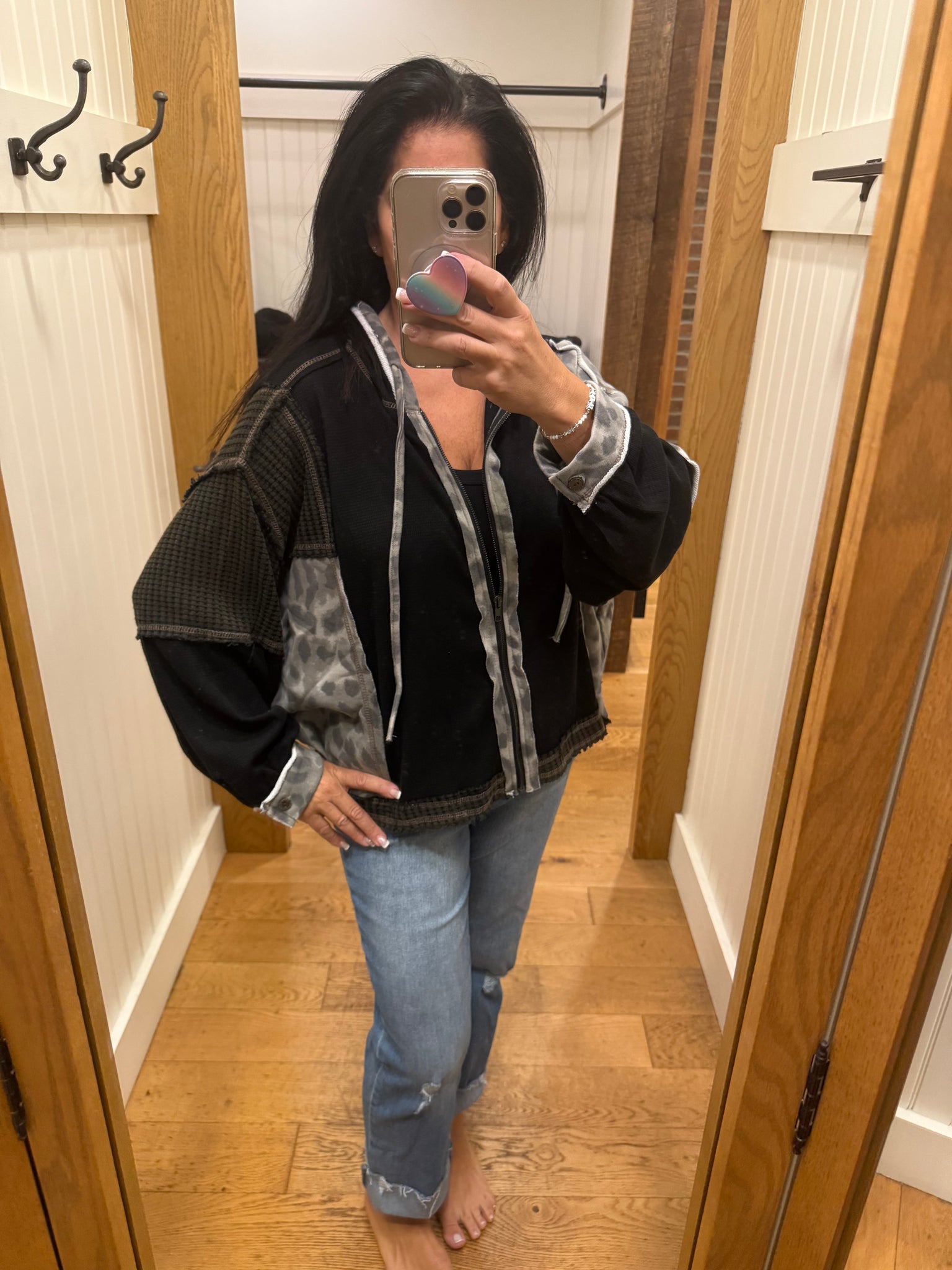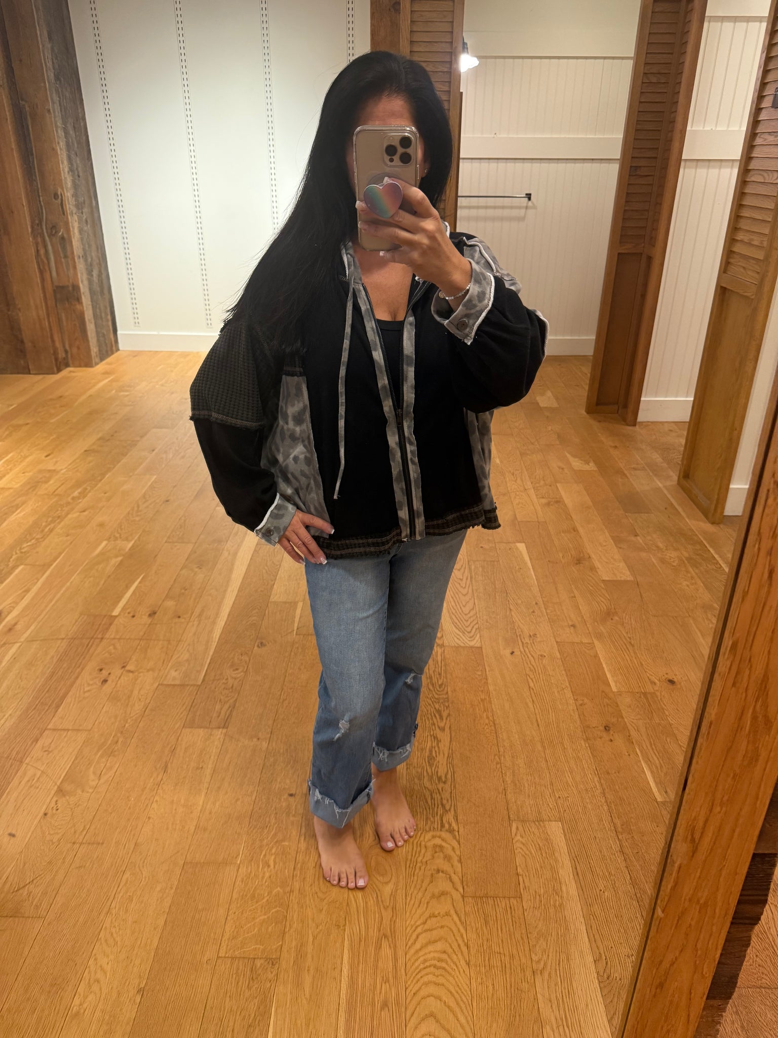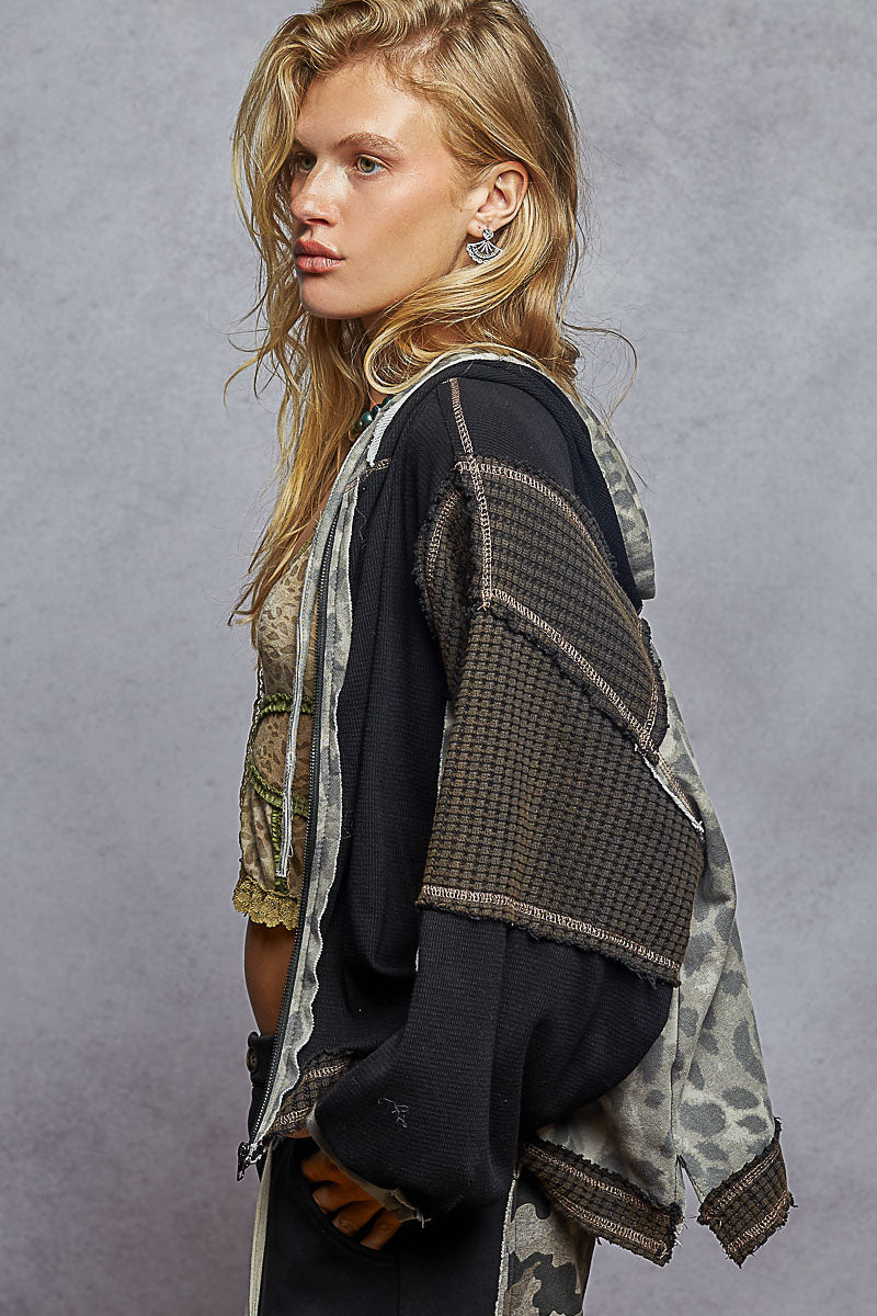 Pol hoodie, balloon sleeve, oversized fit top in thermal and printed fabric mixes with overlock stitch detail pointed solid pattern - Black
