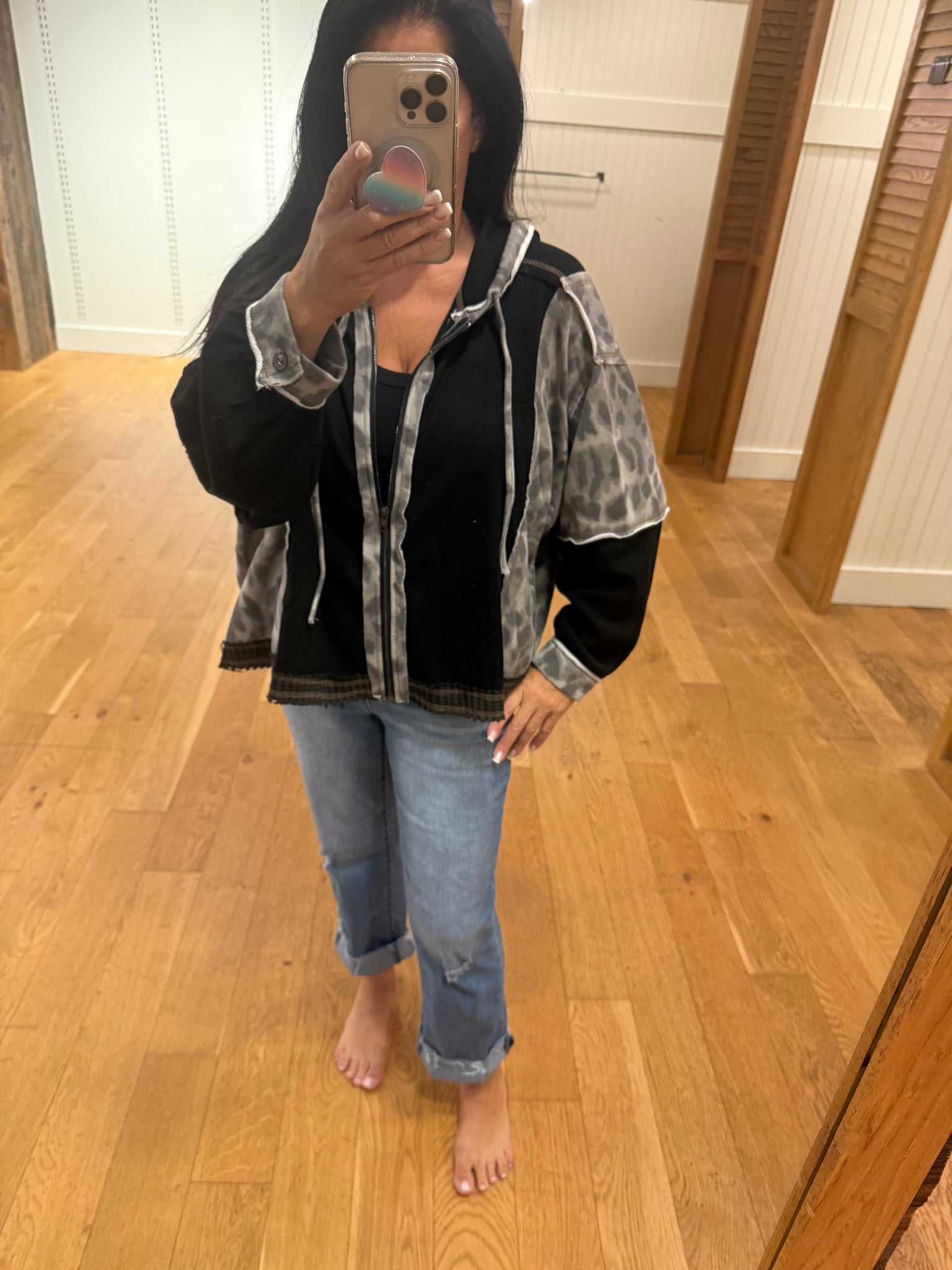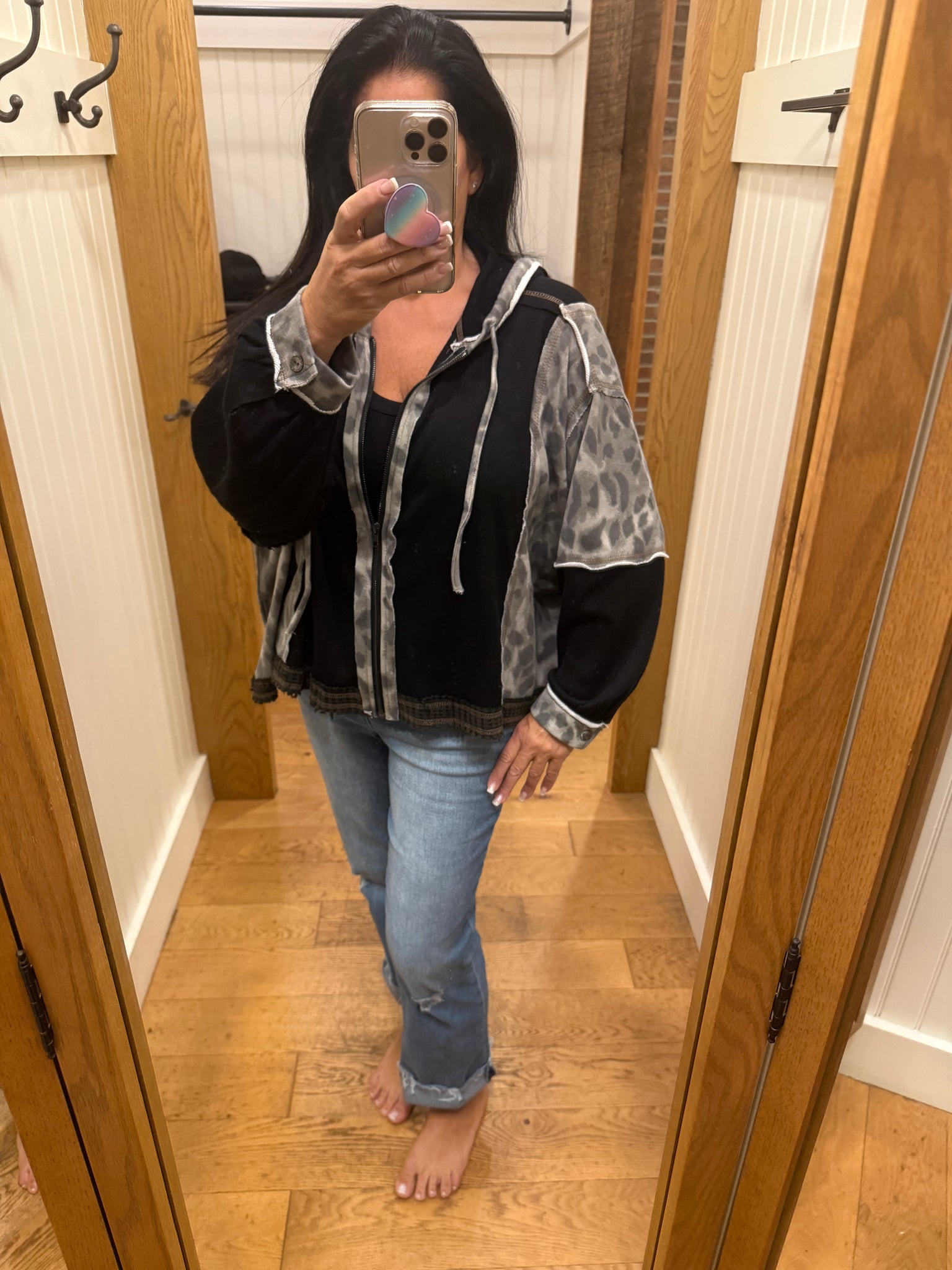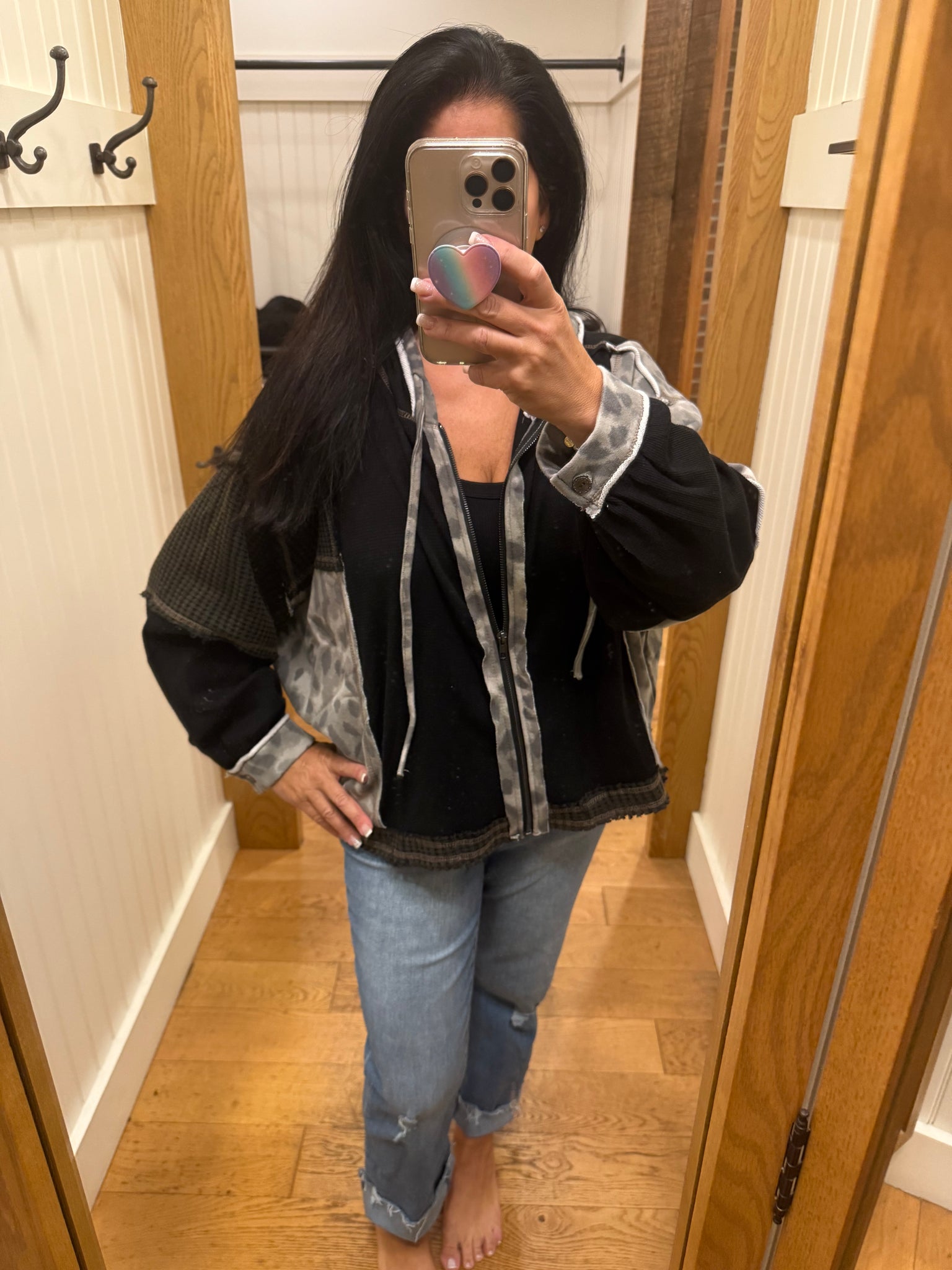 Pol hoodie, balloon sleeve, oversized fit top in thermal and printed fabric mixes with overlock stitch detail pointed solid pattern - Black
