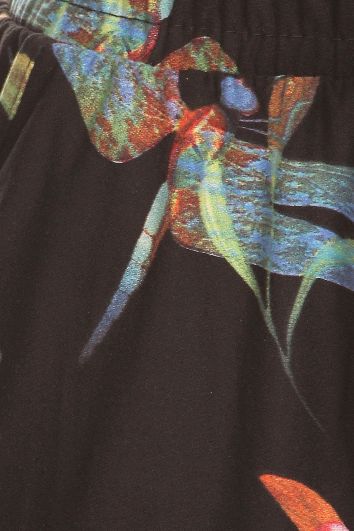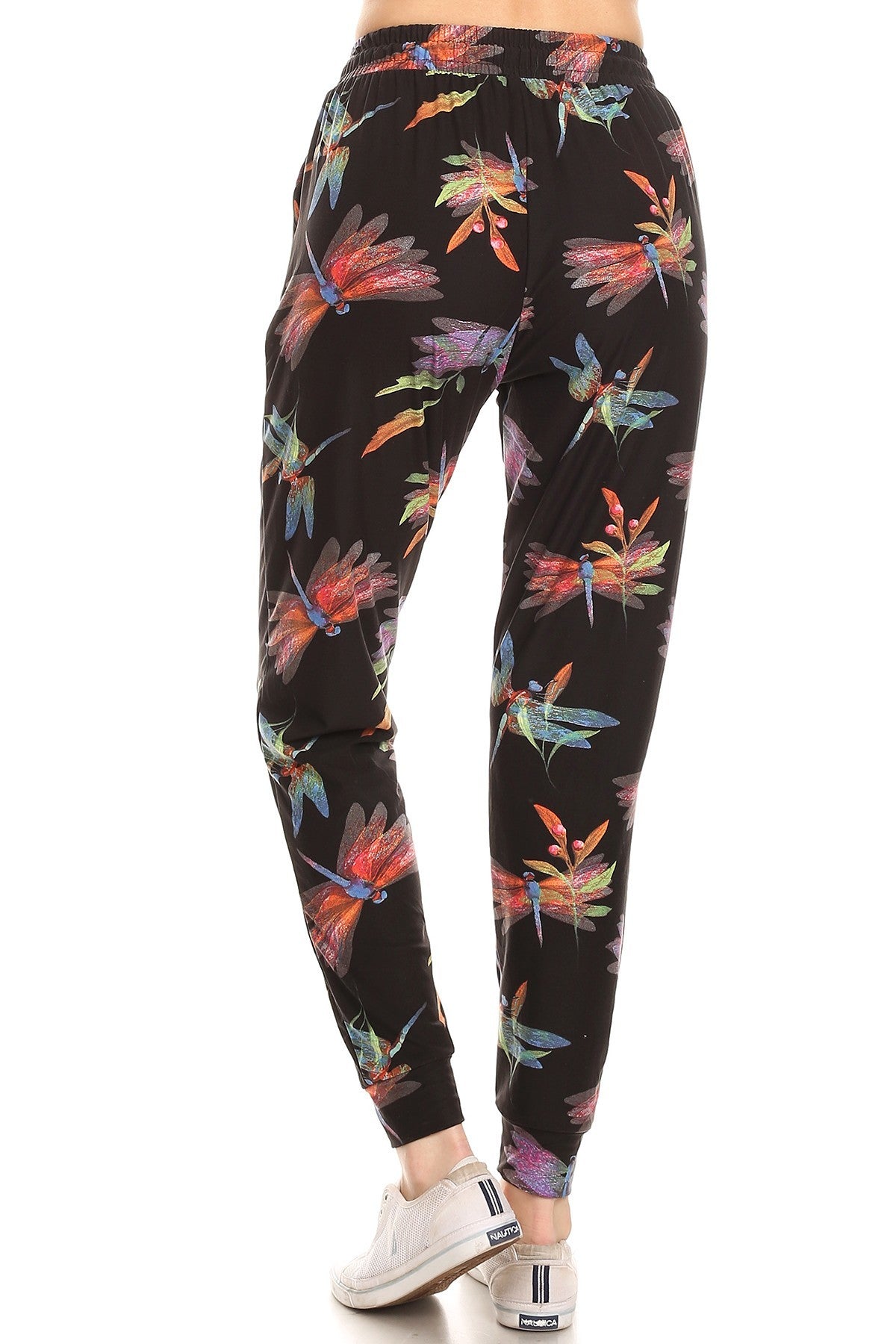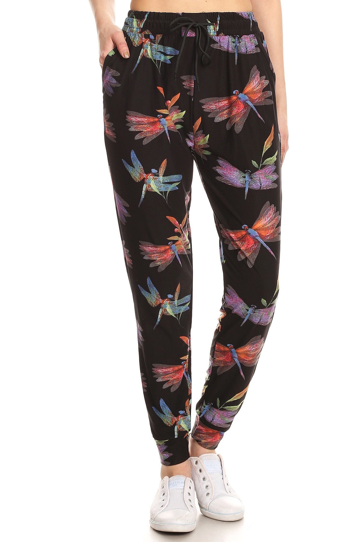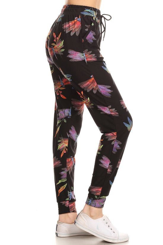 Description: Dragonfly printed joggers with solid trim, drawstring waistband, waist pockets, and cuffed hems.