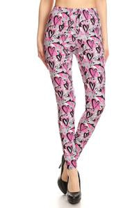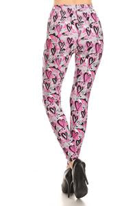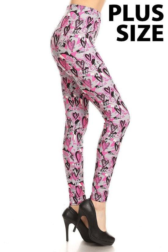 Description: Plus size heart printed, full length, high waisted leggings in a fitted style with an elastic waistband.