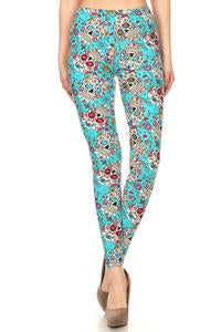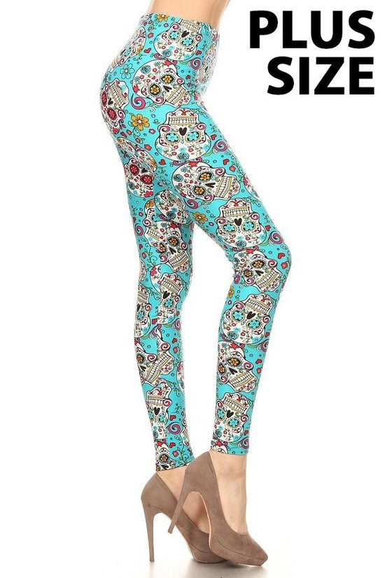 Description: Plus size skull printed, high waisted leggings in a fit style, with an elastic waistband.