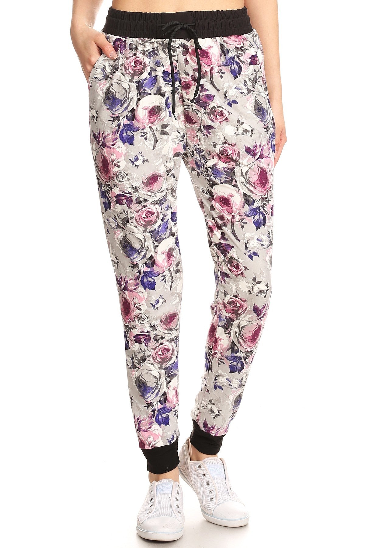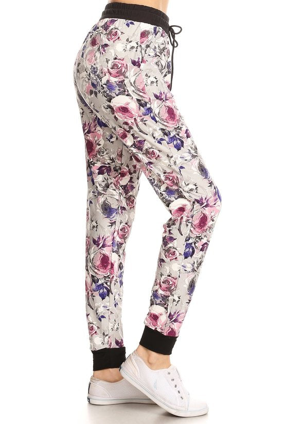 Description: Floral printed, high waisted lounge pants in a slim fit, with a drawstring elastic waistband, and side pockets.
