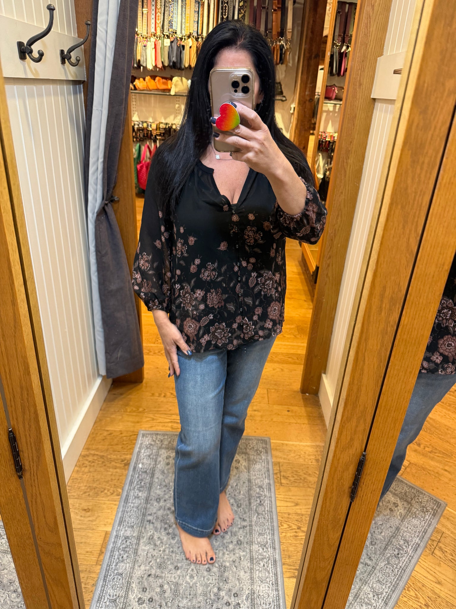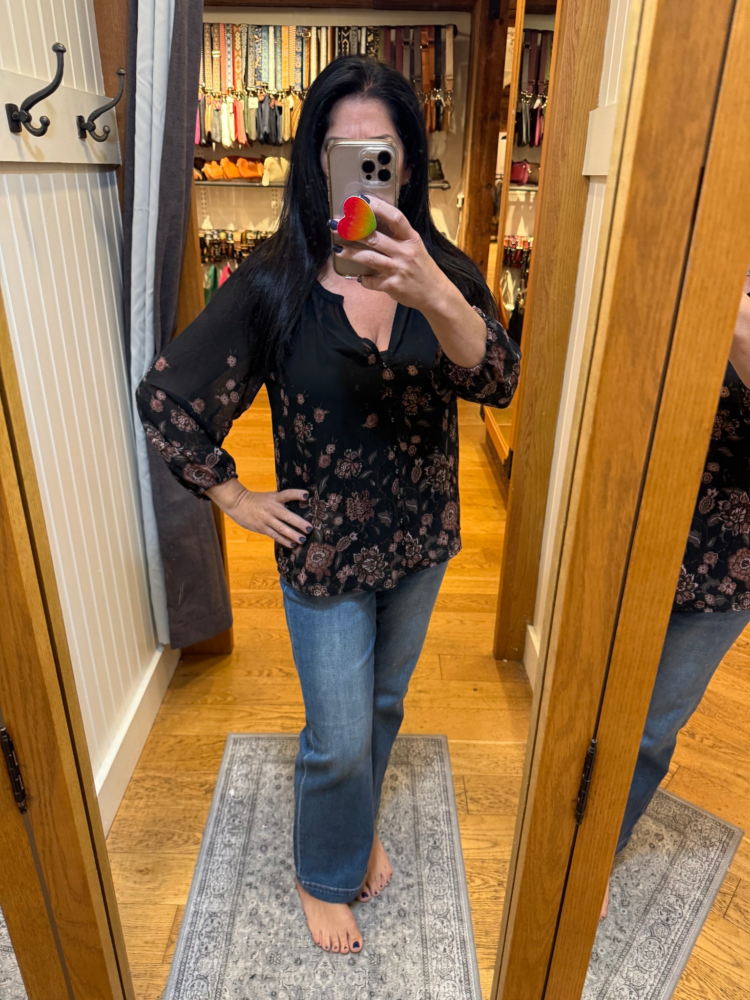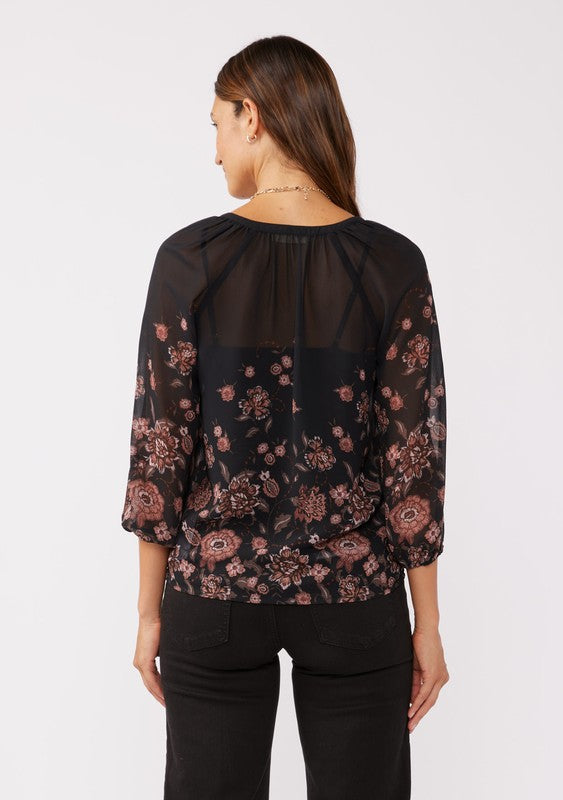 Floral Raglan Button Down Blouse - Black/Dusty Rose