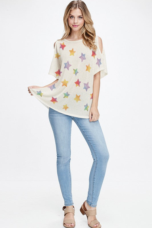 -Rainbow star all over knit cold shoulder top -Soft fabric,casual style,every day wear. -Model size: Small ( 5'10" 31- 23- 34 ) -Made in USA