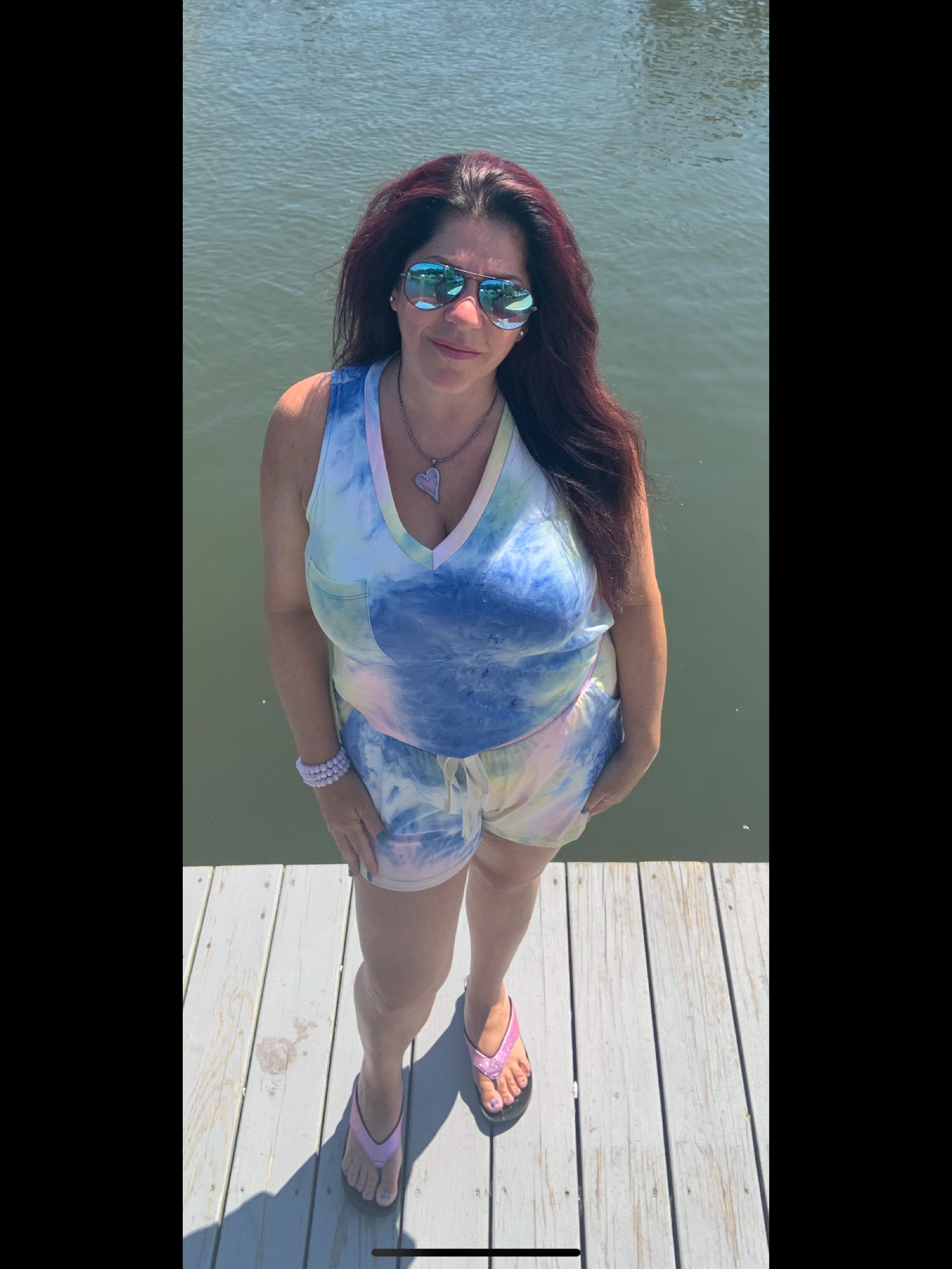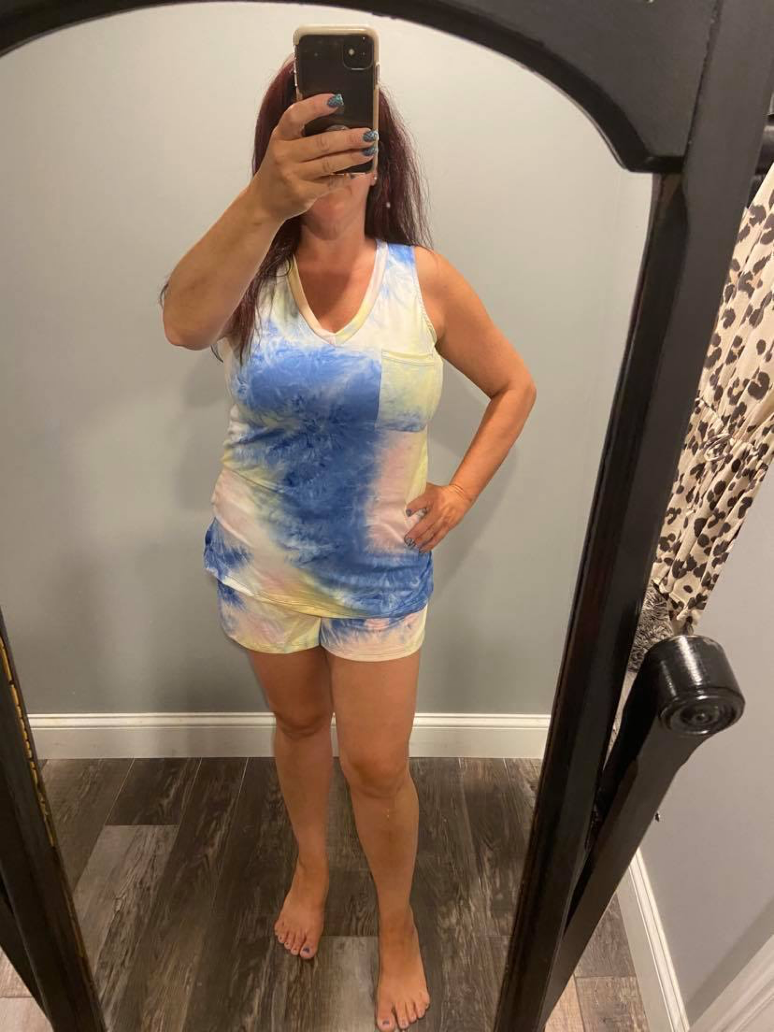 Top runs big. I am wearing a size medium in the picture and I am a true size large
