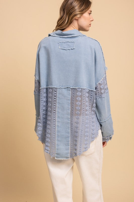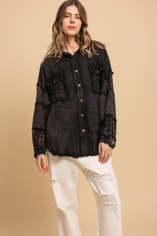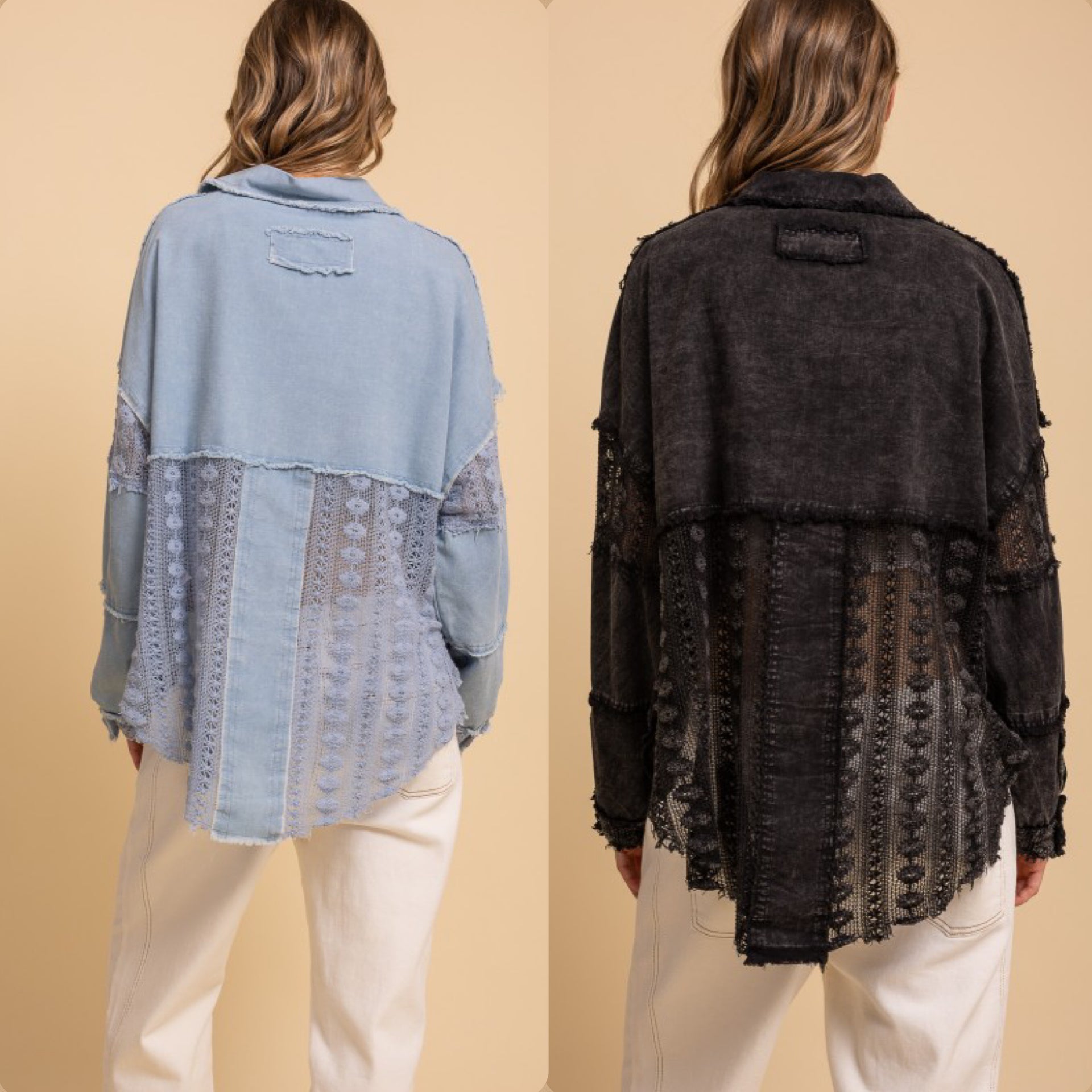 Washed Lace Mix Button Up Shacket - Denim or Black