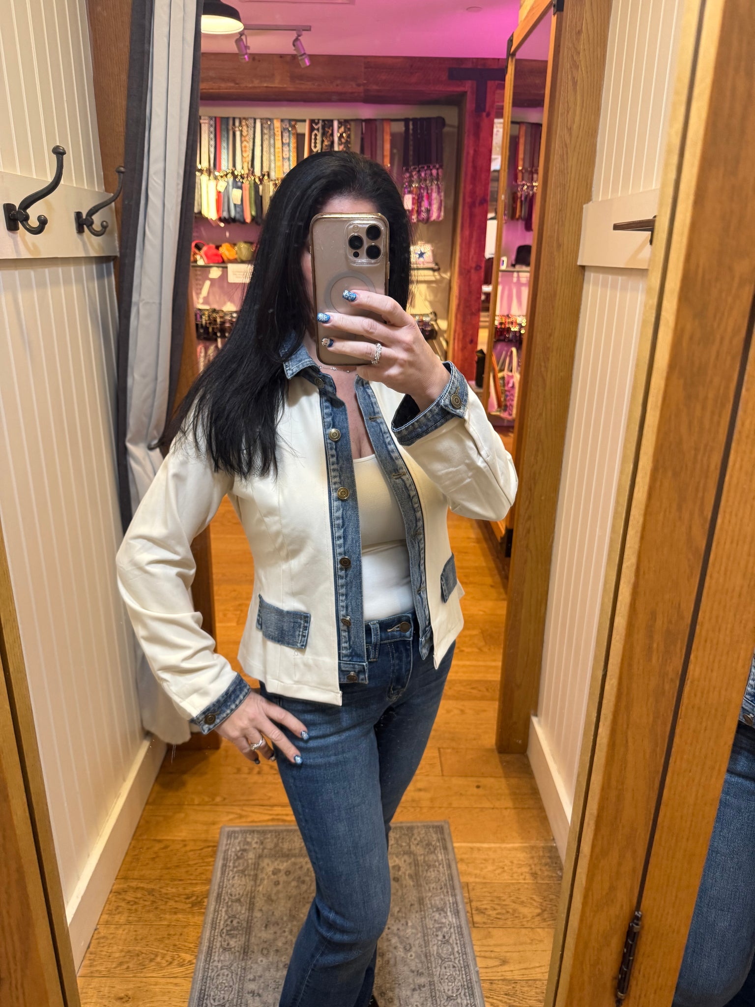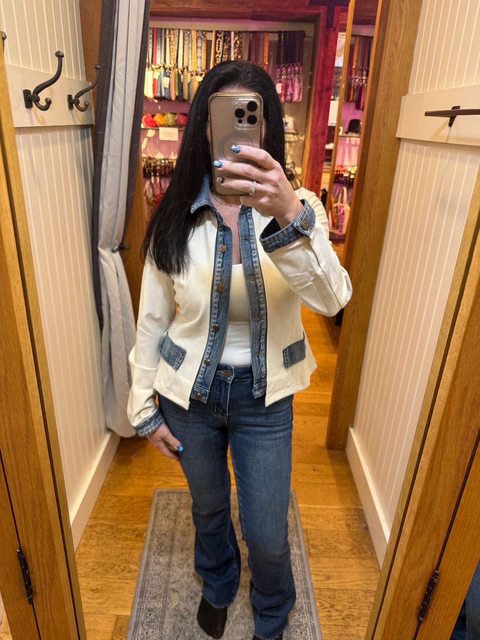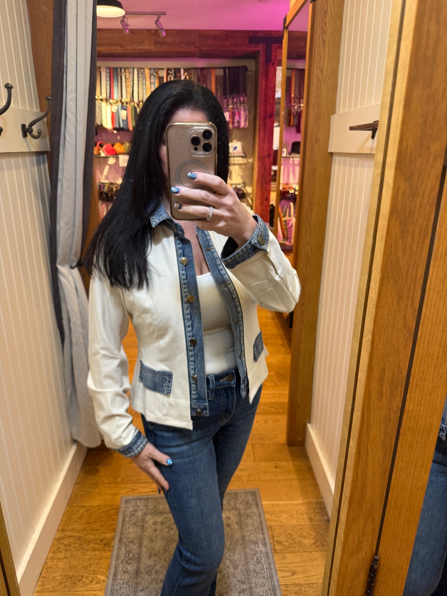 Layered Look Denim Trim Knit Jacket - Ecru