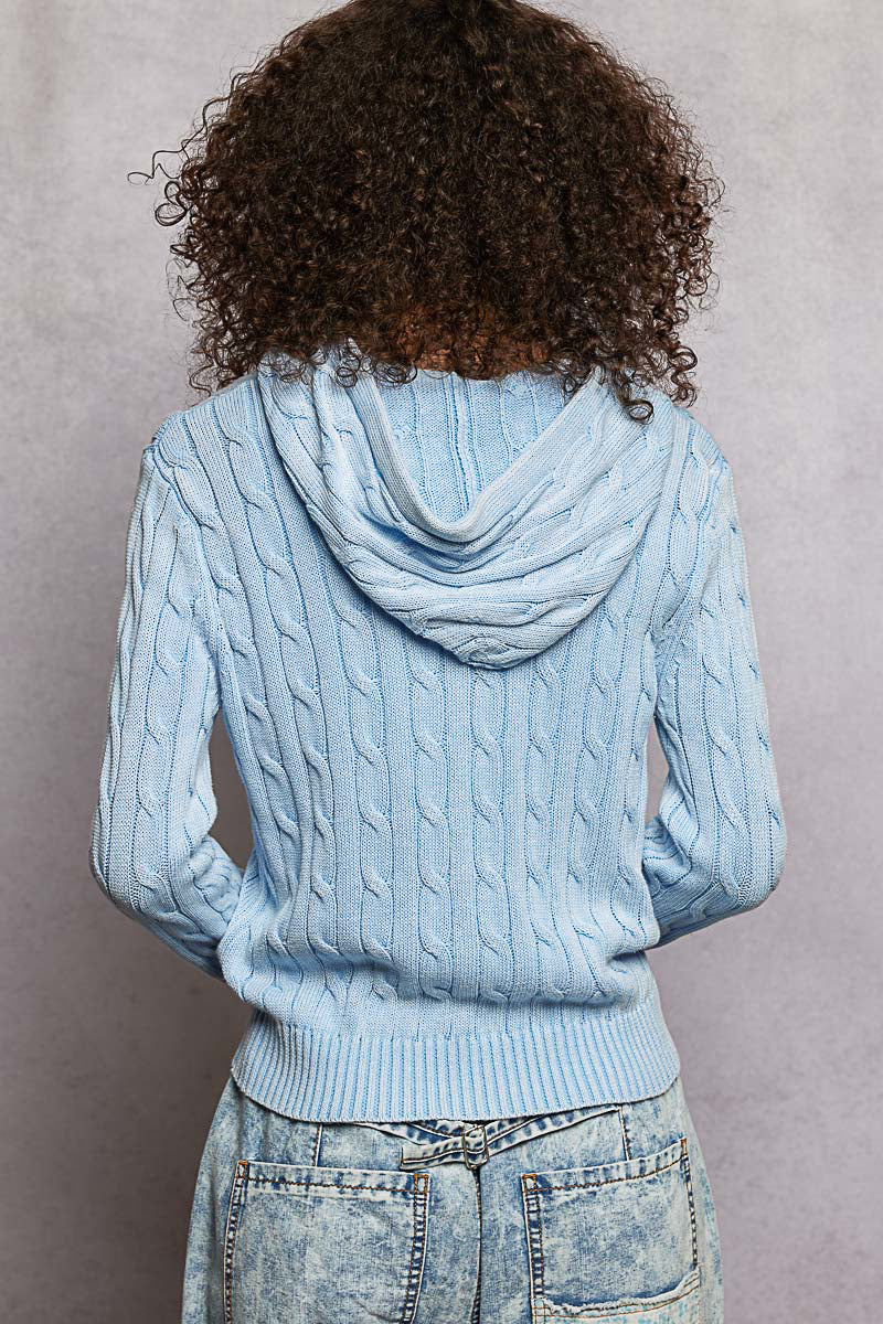 POL hoodie zip up, full sleeve, regular fit top in acrylic sweater with trim tie detail pointed solid pattern - Powder Blue