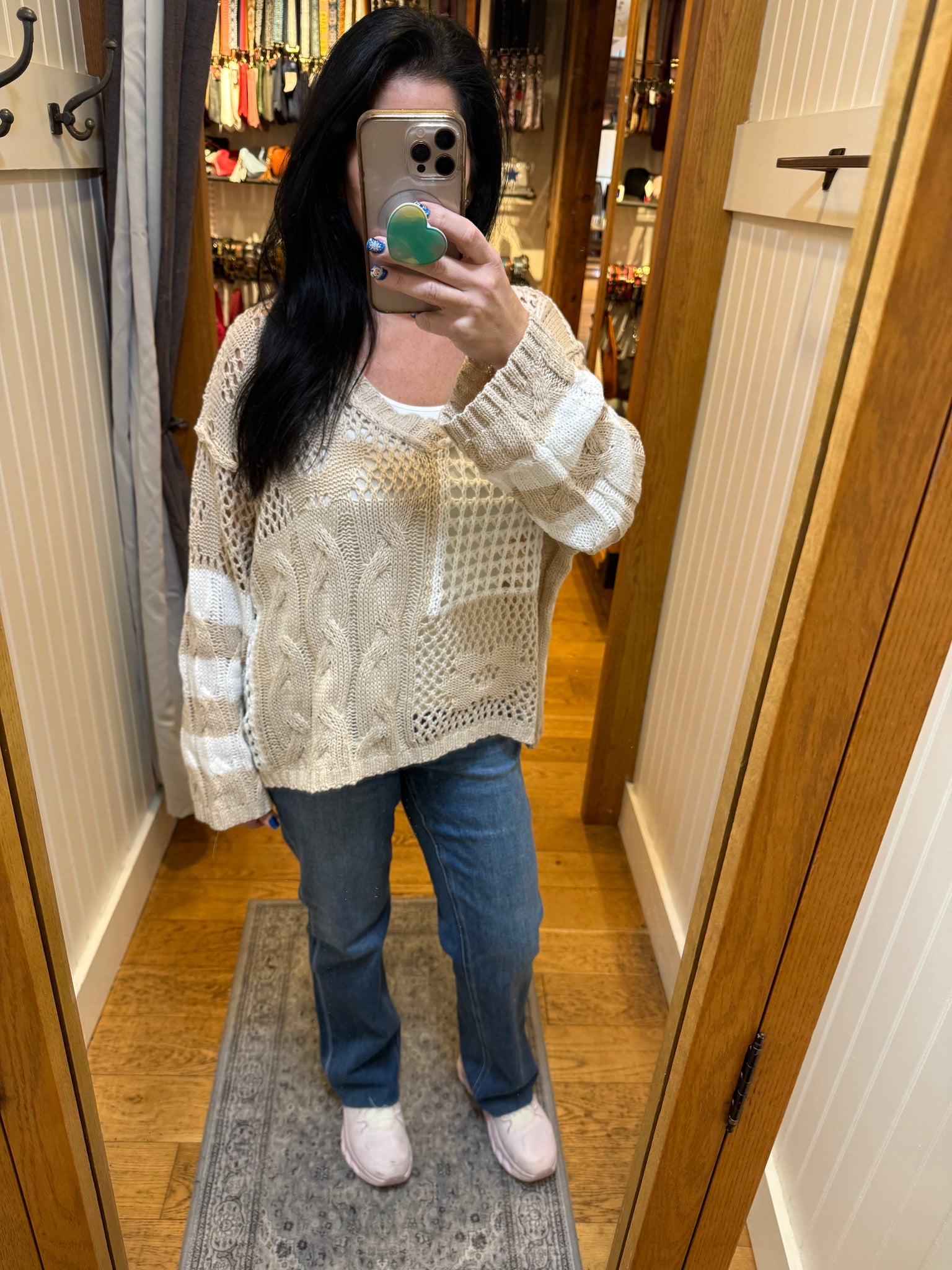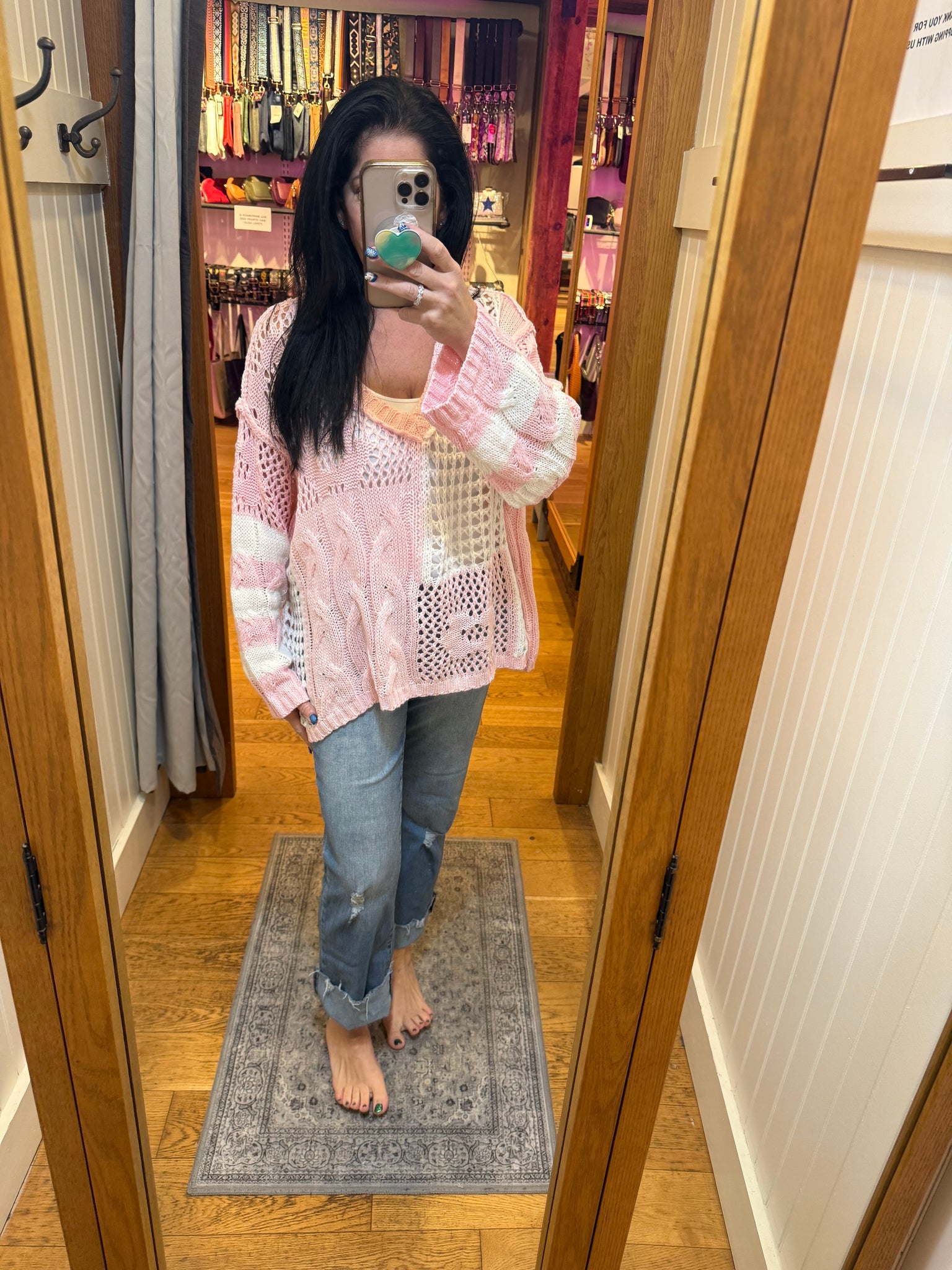 POL long sleeve relaxed fit thin sweater top in airy cotton with twisted weave, color blocked stripe pattern, see through weave, back patch point, rib band detail - Beige,Sky Blue or Soft Pink