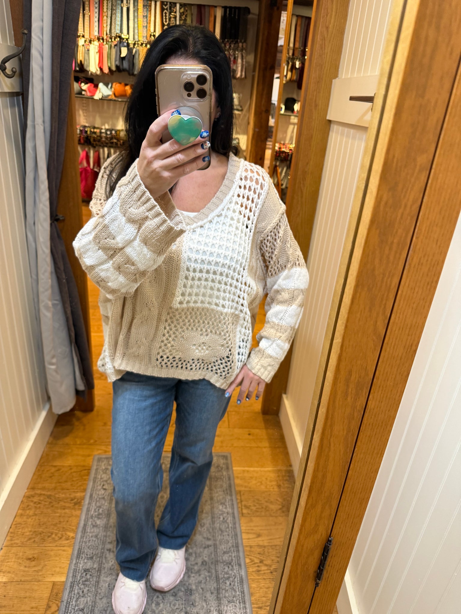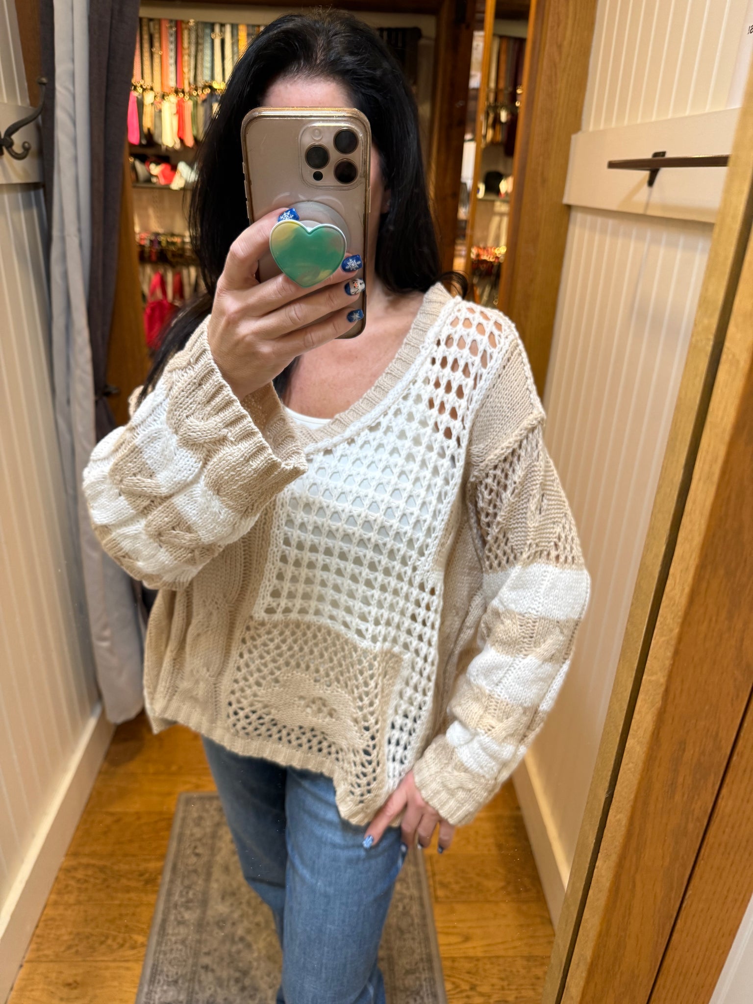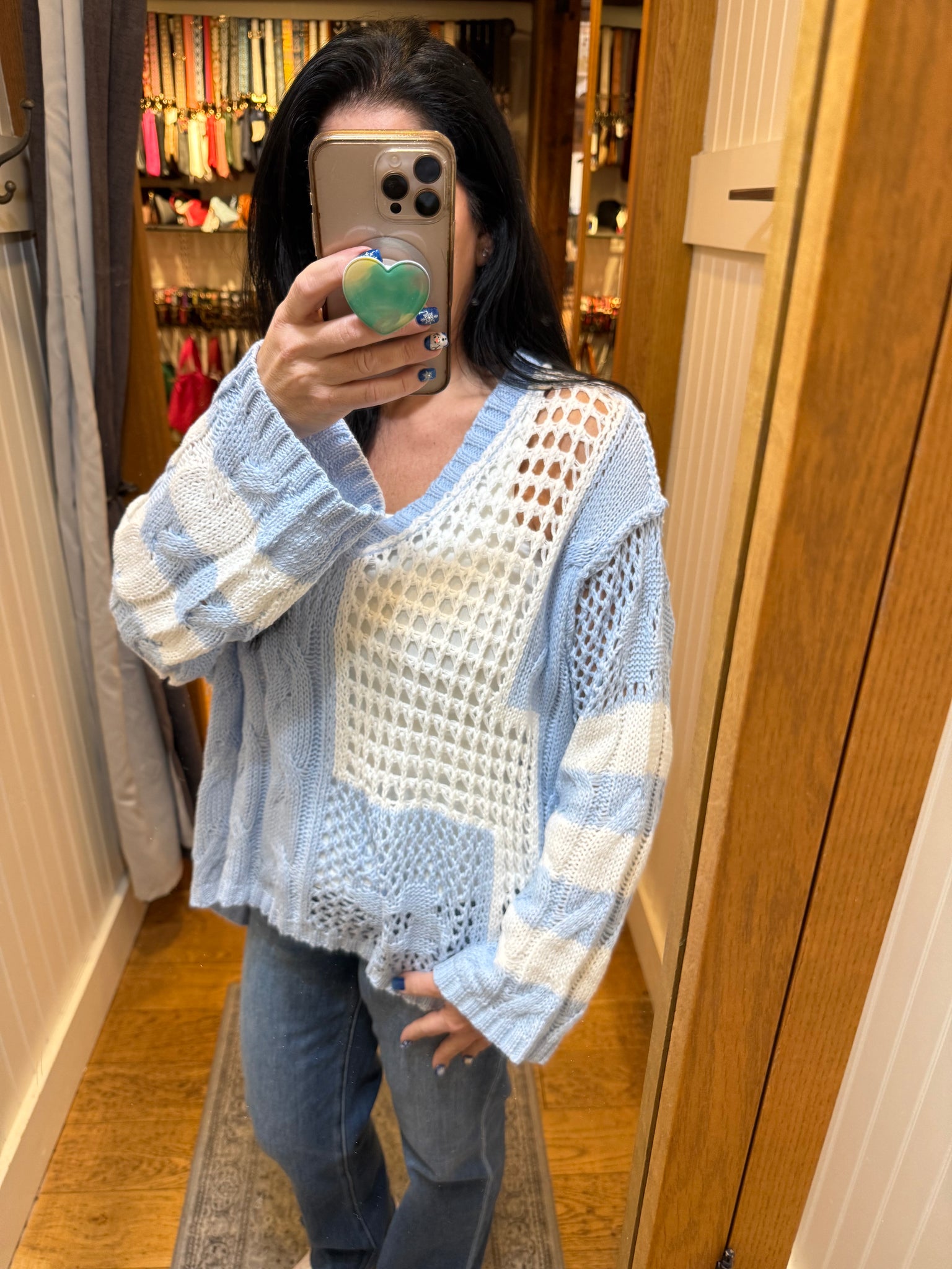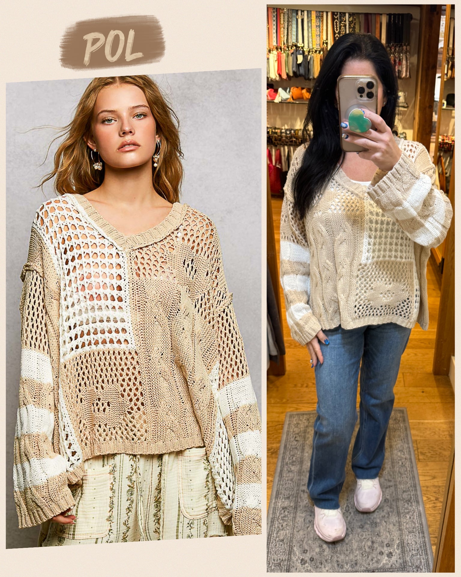 POL long sleeve relaxed fit thin sweater top in airy cotton with twisted weave, color blocked stripe pattern, see through weave, back patch point, rib band detail - Beige, Sky Blue or Soft Pink