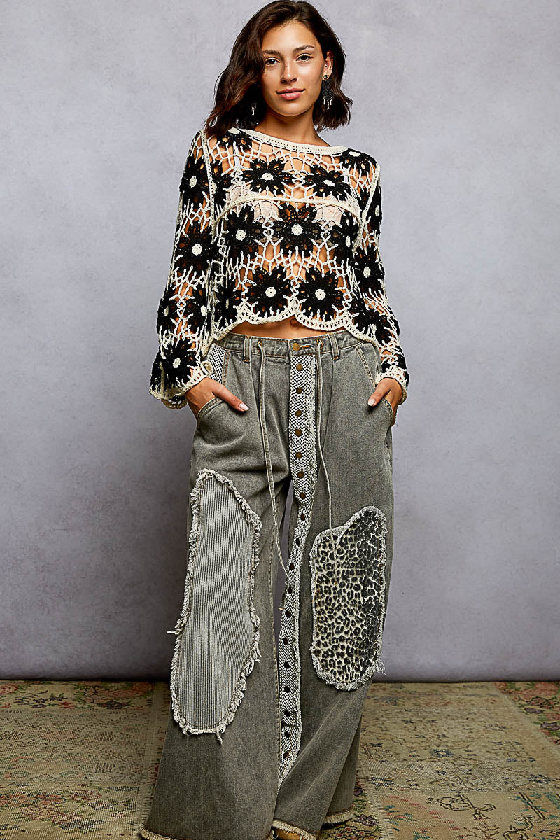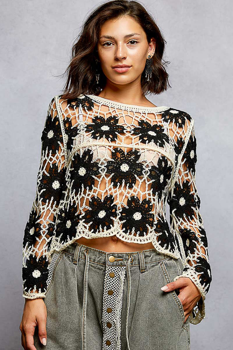 POL round neck long sleeve regular fit top in crochet with loosely weaved floral knit patterns and scalloped edge - Black Multi