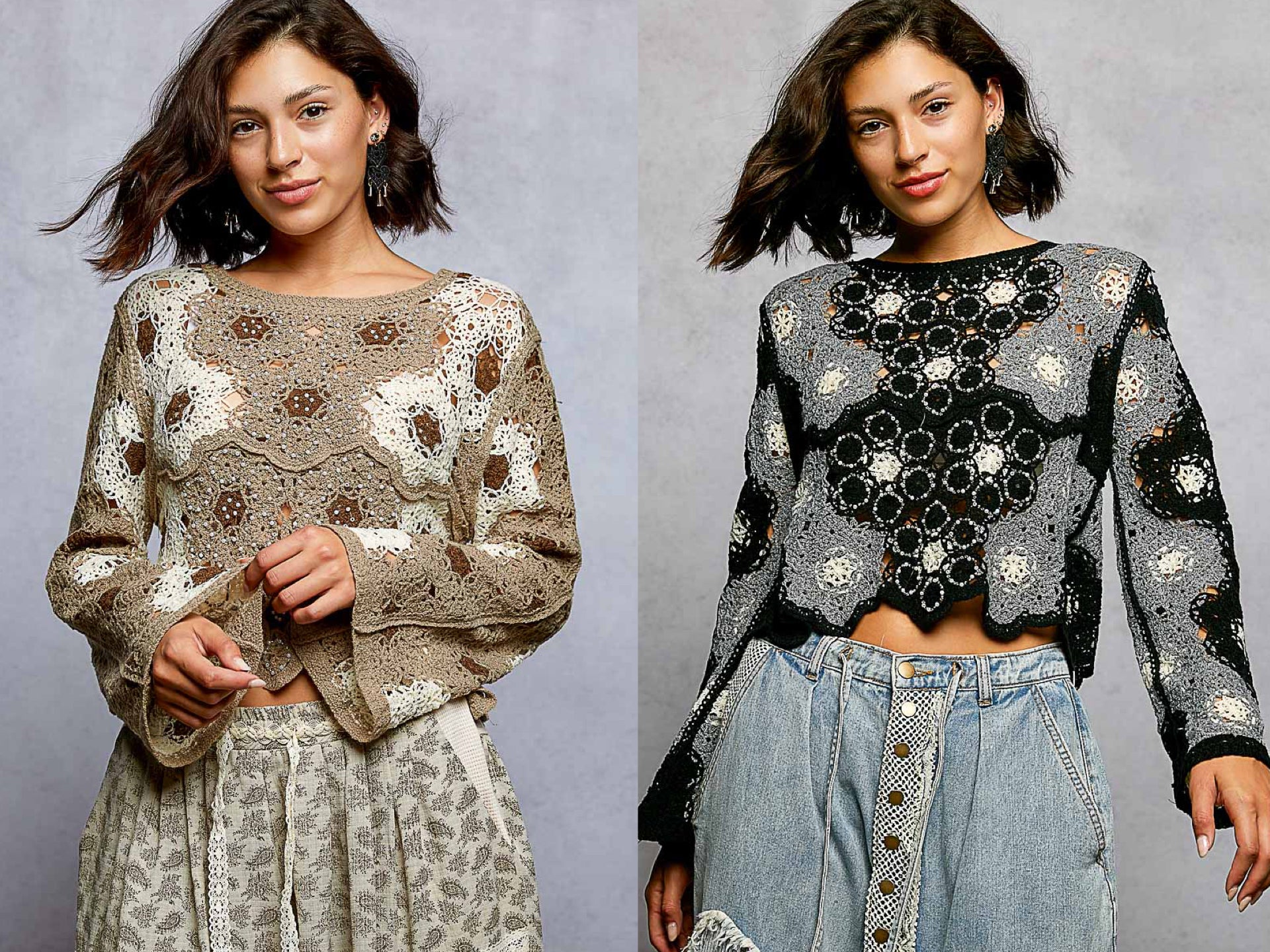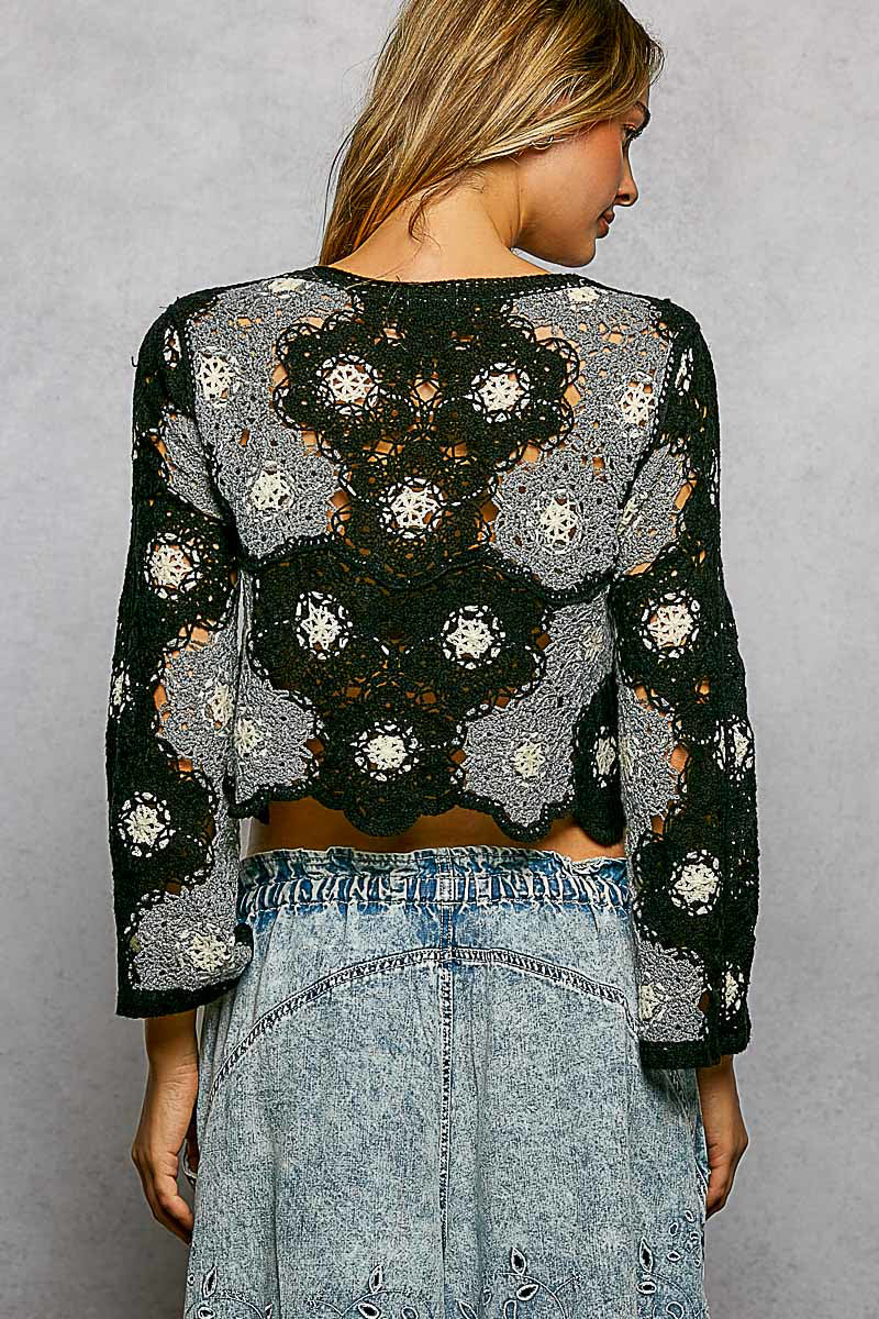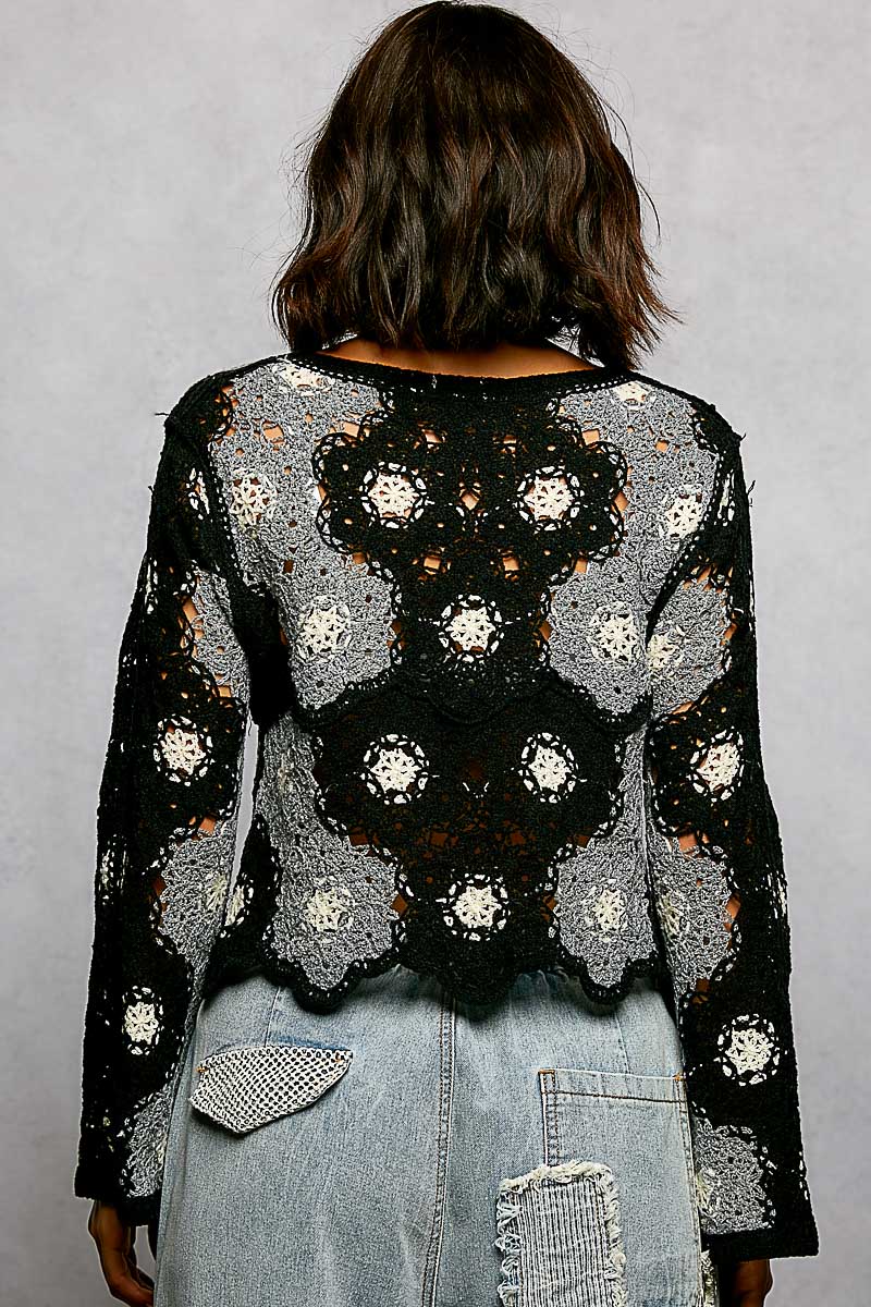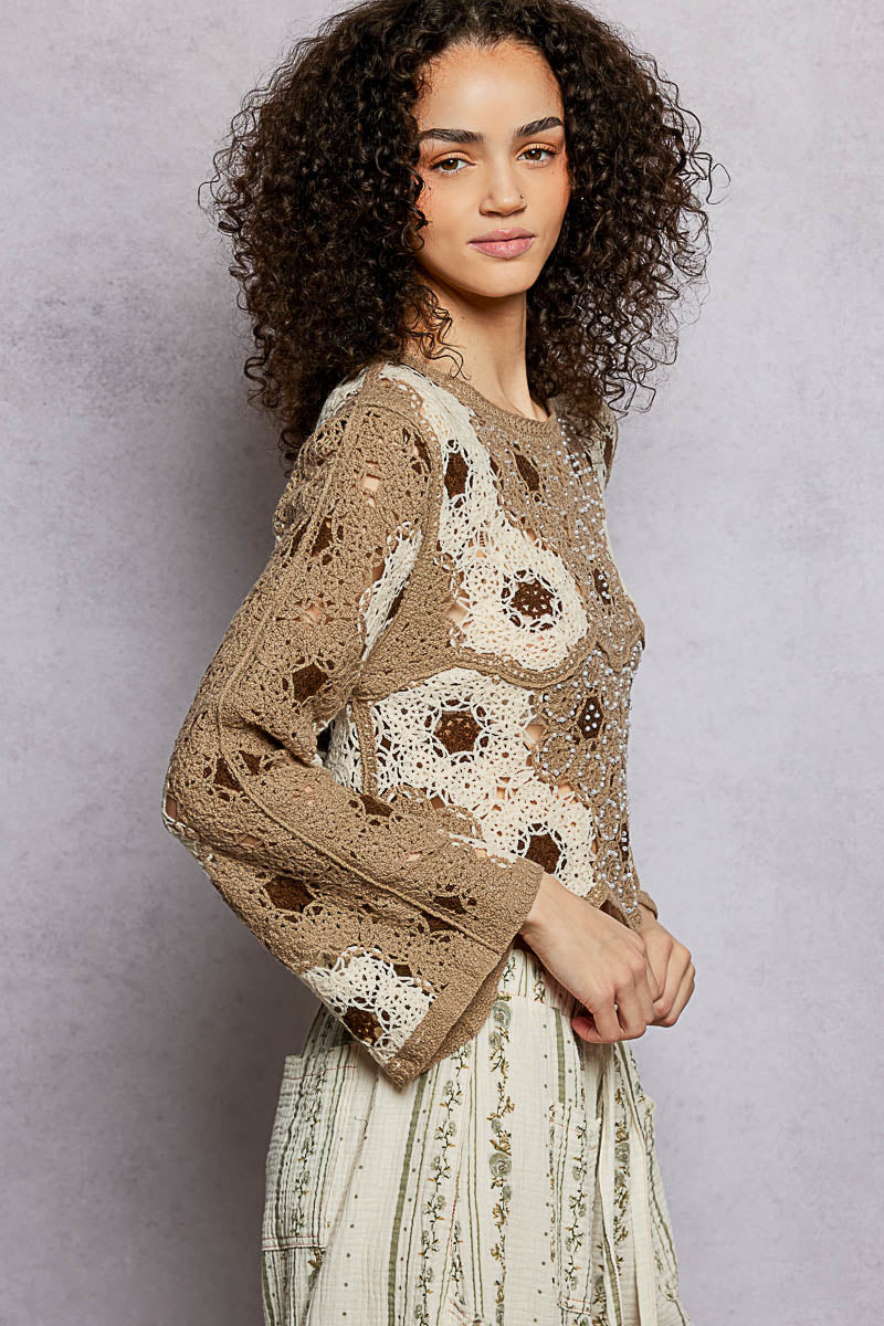 POL round neck long sleeve relaxed fit top in crochet with floral weave knit patterns and beads detail - Black Multi or Mocha Multi