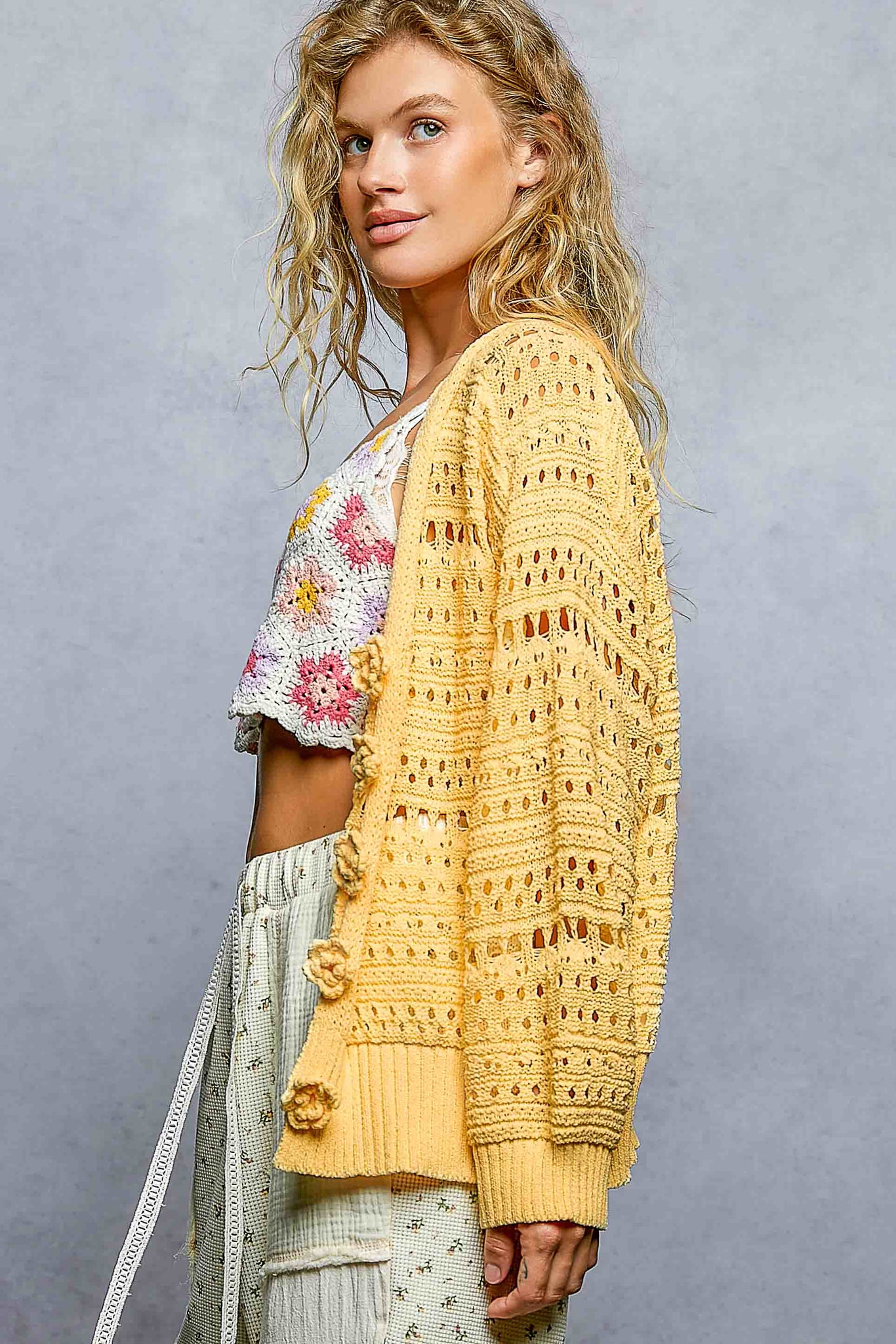 POL soft, open-knit sweater cardigan designed for effortless layering. It features uniquely handcrafted 3D floral buttons that serve as the key focal point. The silhouette is relaxed and easy without leaning too oversized, offering a comfortable and flattering fit - Dandelion