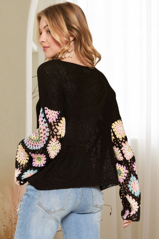 MULTI-COLOR GRANNY SQUARE CROCHET SLEEVE LIGHTWEIGHT KNIT TOP 100% POLYESTER *Multi-color crochet sleeve *Drop shoulder *Lightweight sweater knit *Loose fit