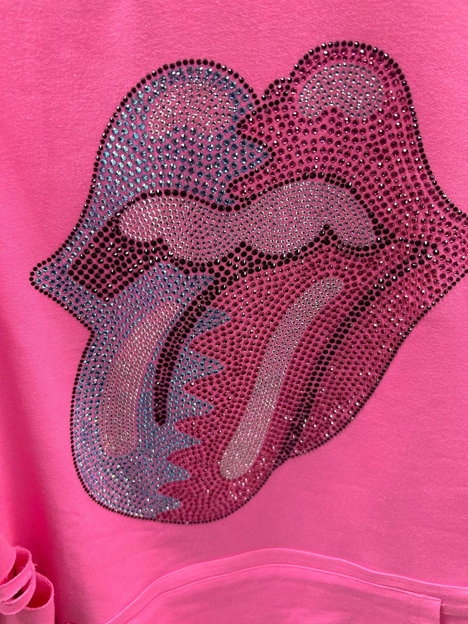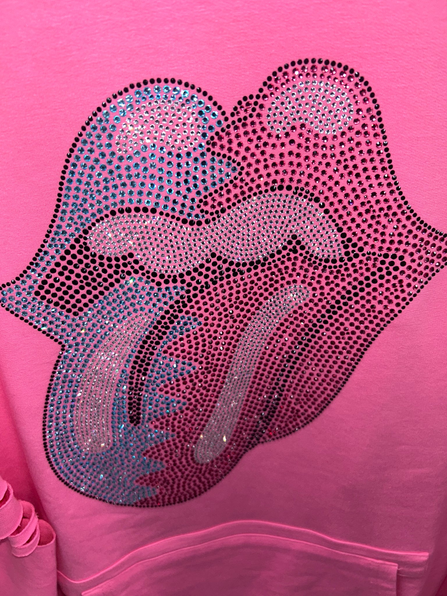Bling Lips Tongue Band Distressed Hoodie - Pink X-Large