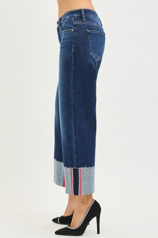 Risen Tummy Control Mid Rise Crop Wide Cuffed Jeans - Deep Blue